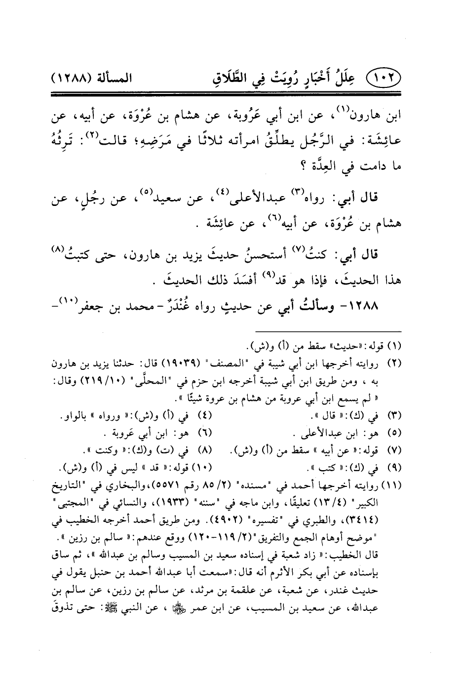 ١٢٨٨- وسألتُ أَبِي عَنْ حديثٍ رَوَاهُ غُنْدَرٌ - محمد بن جعفر (١٠)