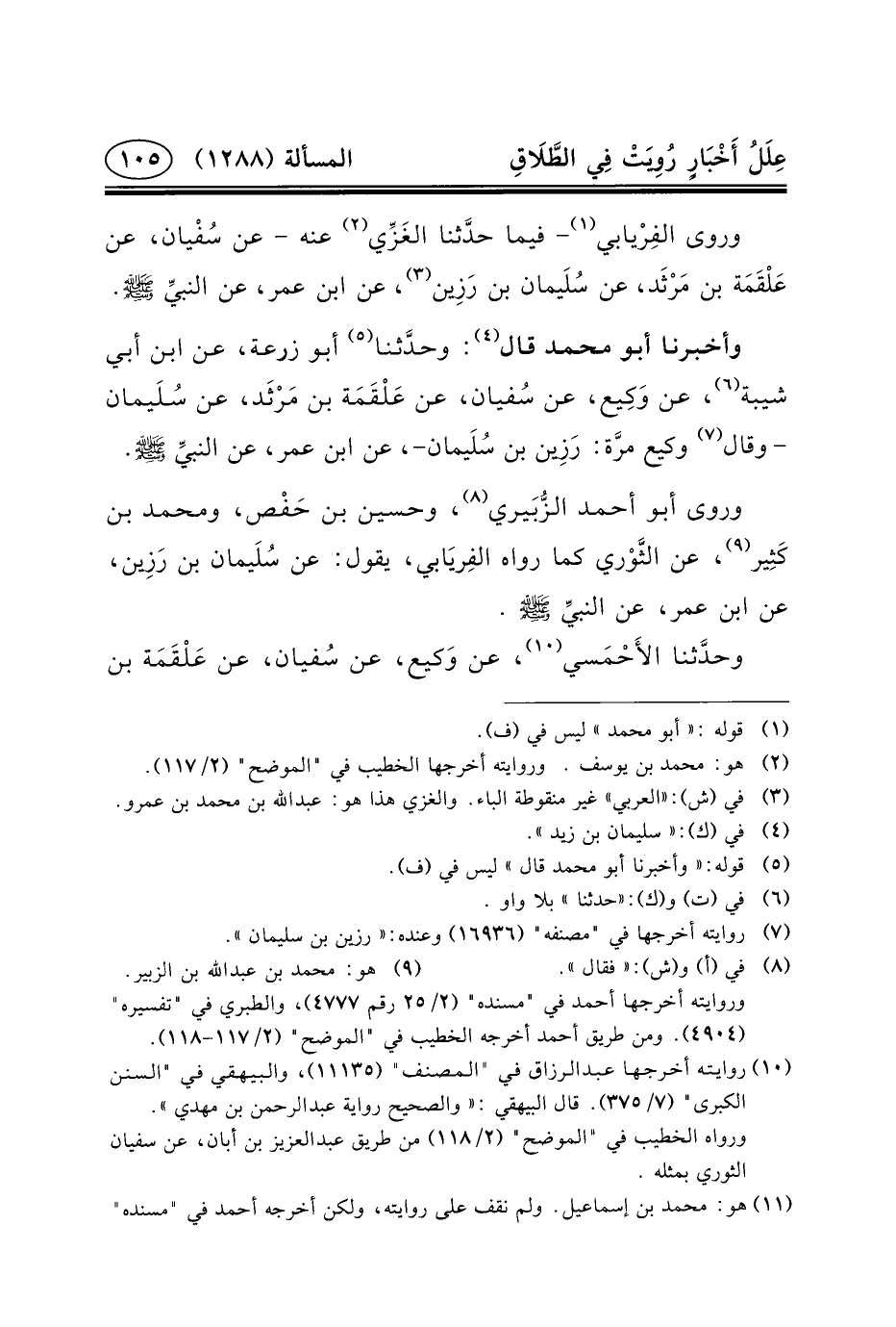 وَأَخْبَرَنَا أَبُو مُحَمَّدٍ قَالَ (٤) : وحدَّثنا (٥) أَبُو زُرْعَةَ، عَنِ ابْنِ أَبِي شَيْبَةَ (٦) ، عَنْ وَكِيع، عَنْ سُفيان، عَنْ عَلْقَمَة بْنِ مَرْثَد، عَنْ سُلَيمان - وَقَالَ (٧) وَكِيعٌ مرَّة: رَزِين بْنُ سُلَيمان-، عَنِ ابْنِ عُمَرَ، عن النبيِّ (ص) .
