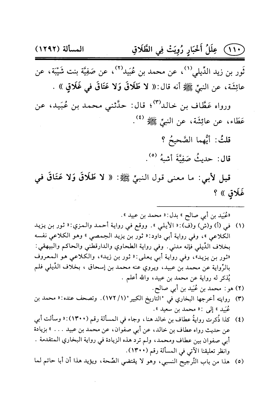 (٤) كذا ذُكرت روايةُ عطاف بن خالد هنا، وجاء في المسألة رقم (١٣٠٠) : «وَسَأَلْتُ أَبِي عَنْ حَدِيثٍ رَوَاهُ عَطَّافُ بْنُ خَالِدٍ، عَنْ أَبِي صَفْوَانَ، عَنْ مُحَمَّدِ بْنِ عُبَيْدٍ ... » بزيادة أبي صفوان بين عطاف ومحمد، ولم ترد هذه الزيادة في رواية البخاري المتقدمة. وانظر تعليقنا الآتي في المسألة رقم (١٣٠٠) .