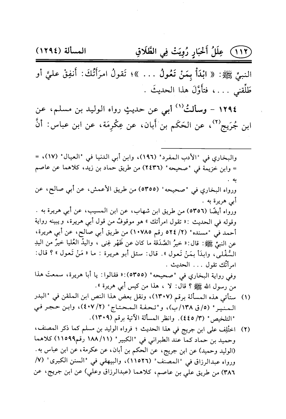 النبيِّ (ص) : ابْدَأْ بِمَنْ تَعُولُ ... ؛ تَقولُ امرَأَتُكَ: أَنفِقْ عليَّ أَوْ طَلِّقني ... ، فتأَوَّلَ هَذَا الحديثَ.