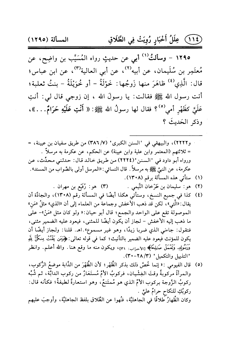 ١٢٩٥ - وسألتُ (١) أَبِي عَنْ حديثٍ رَوَاهُ المُسَيَّب بْنُ واضِح، عَنْ مُعتَمِر بْنُ سُلَيمان، عَنْ أَبِيهِ (٢) ، عَنْ أَبِي الْعَالِيَةِ (٣) ، عَنِ ابْنِ عَبَّاسٍ؛ قَالَ: الَّذِي (٤) ظاهَرَ مِنْهَا زَوجُها: خَوْلَةُ - أَوْ خُوَيْلَةُ - بنتُ ثَعْلَبَةَ؛ أتت رسول الله (ص) فَقَالَتْ: يَا رسولَ اللَّهِ، إِنَّ زَوْجِي قَالَ لِي: أنتِ عَلَيَّ كظَهْرِ أُمِّي (٥) ؟ فَقَالَ لَهَا رسولُ الله (ص) : أَنْتِ عَلَيْهِ حَرَامٌ ... ، وَذَكَرَ الحَديثَ؟