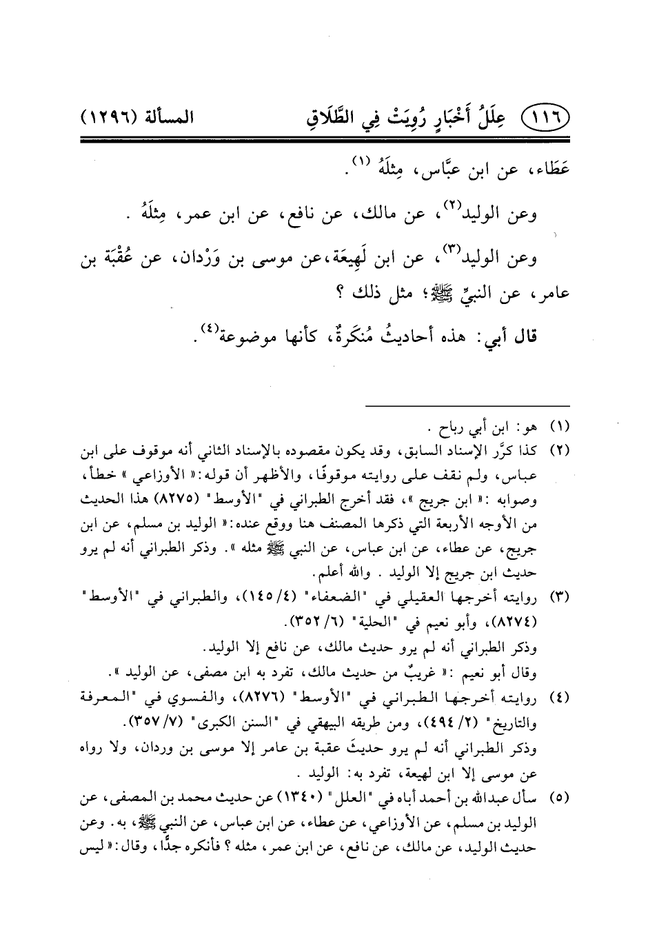 (٤) سأل عبد الله بن أحمد أباه في "العلل" (١٣٤٠) عن حديث مُحَمَّدُ بْنُ الْمُصَفَّى، عَنِ الْوَلِيدِ بْنِ مُسْلِمٍ، عَنِ الأَوْزَاعِيِّ، عَنْ عَطَاءٍ، عَنِ ابْنِ عَبَّاسٍ، عَنِ النبي (ص) ، به. وعن حديث الْوَلِيدِ، عَنْ مَالِكٍ، عَنْ نَافِعٍ، عن ابن عمر، مثله؟ فأنكره جدًّا، وقال: «ليس يروى فيه إلا عن الحسن، عن النبي (ص) » .