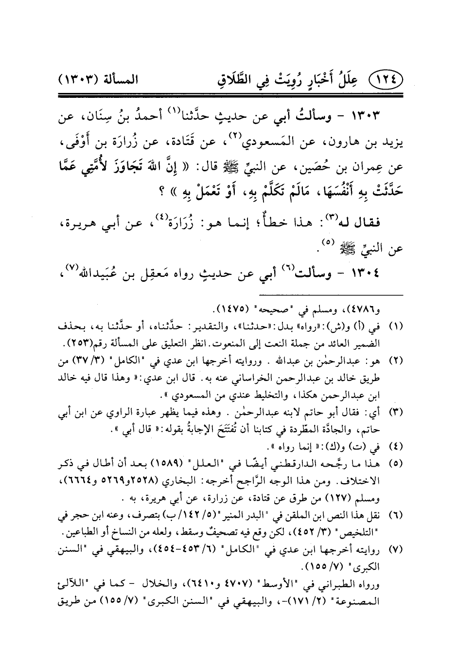 ١٣٠٣ - وسألتُ أَبِي عَنْ حديثٍ حدَّثنا (١) أحمدُ بنُ سِنَان، عَن يزيد بْنِ هَارُونَ، عَنِ المَسعودي (٢) ، عَنْ قَتَادة، عَنْ زُرارَة بْنِ أَوْفَى، عَنْ عِمران بْنِ حُصَين، عَنِ النبيِّ (ص) قَالَ: إِنَّ اللهَ تَجَاوَزَ لأُمَّتِي عَمَّا حَدَّثَتْ بِهِ أَنْفُسَهَا، مَالَمْ تَكَلَّمْ بِهِ، أَوْ تَعْمَلْ بِهِ؟