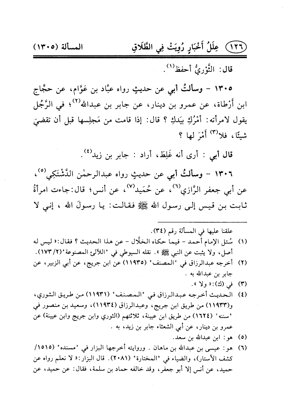 ١٣٠٥ - وسألتُ أَبِي عن حديثٍ رواه عبَّاد ابن عَوَّام، عن حجَّاج ابن أَرْطاة، عن عمرو ابن دينار، عن جابر بن عبد الله (٢) ؛ فِي الرَّجُل يَقُولُ لامْرَأَتِهِ: أمْرُكِ بيَدكِ؟ قَالَ: إِذَا قَامَتْ مِنْ مَجلِسها قَبْلَ أَنْ تقضيَ شَيْئًا، فَلا (٣) أَمْرَ لَهَا؟