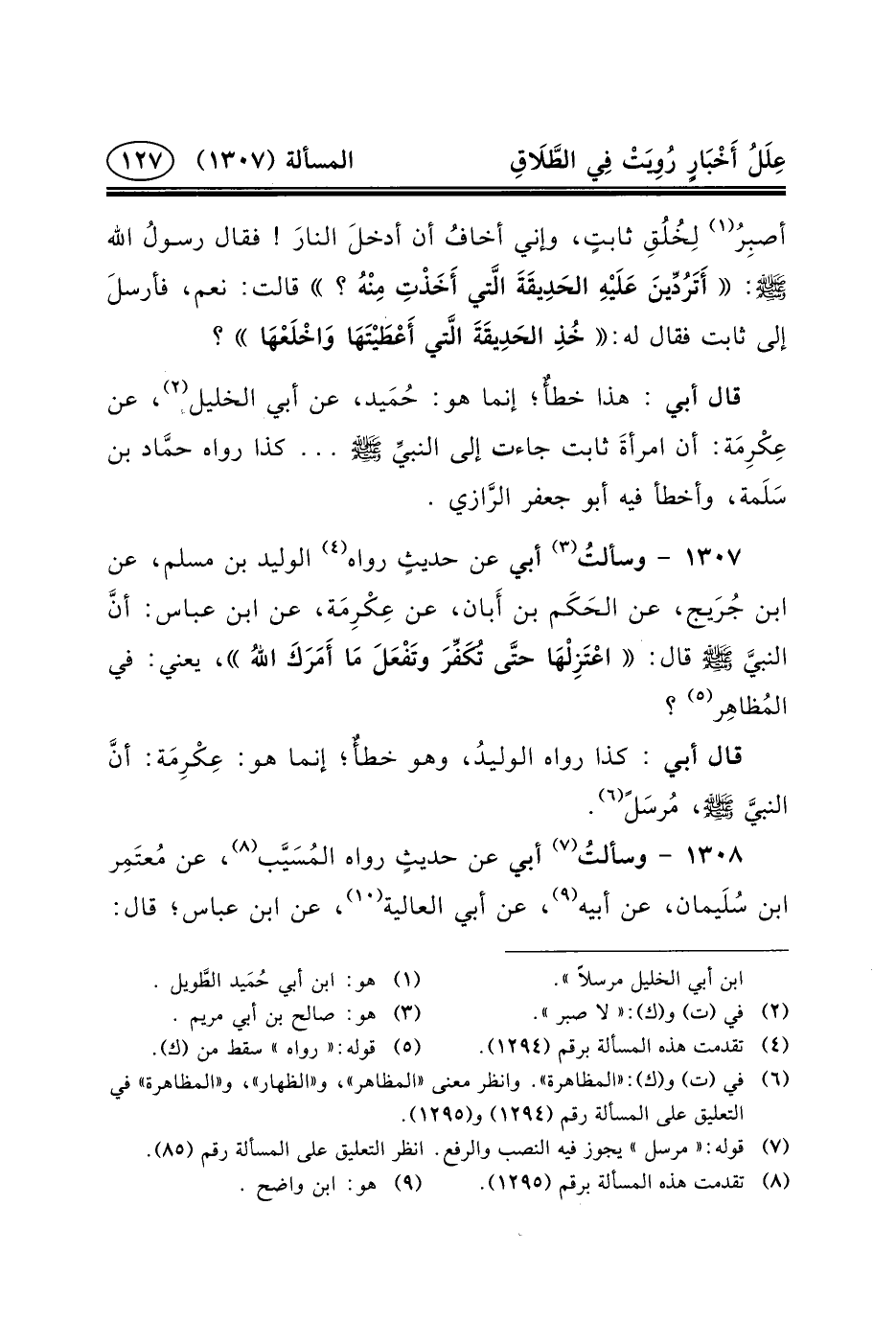 ١٣٠٧ - وسألتُ (٣) أَبِي عَنْ حديثٍ رَوَاهُ (٤) الْوَلِيدِ بْنِ مُسْلِمٍ، عَنِ ابْن جُرَيج، عن الحَكَم ابن أَبان، عَنْ عِكْرِمَة، عَنِ ابْنِ عباس: أنَّ النبيَّ (ص) قَالَ: اعْتَزِلْهَا حتَّى تُكَفِّرَ وتَفْعَلَ مَا أَمَرَكَ اللهُ، يَعْنِي: فِي المُظاهِر (٥) ؟