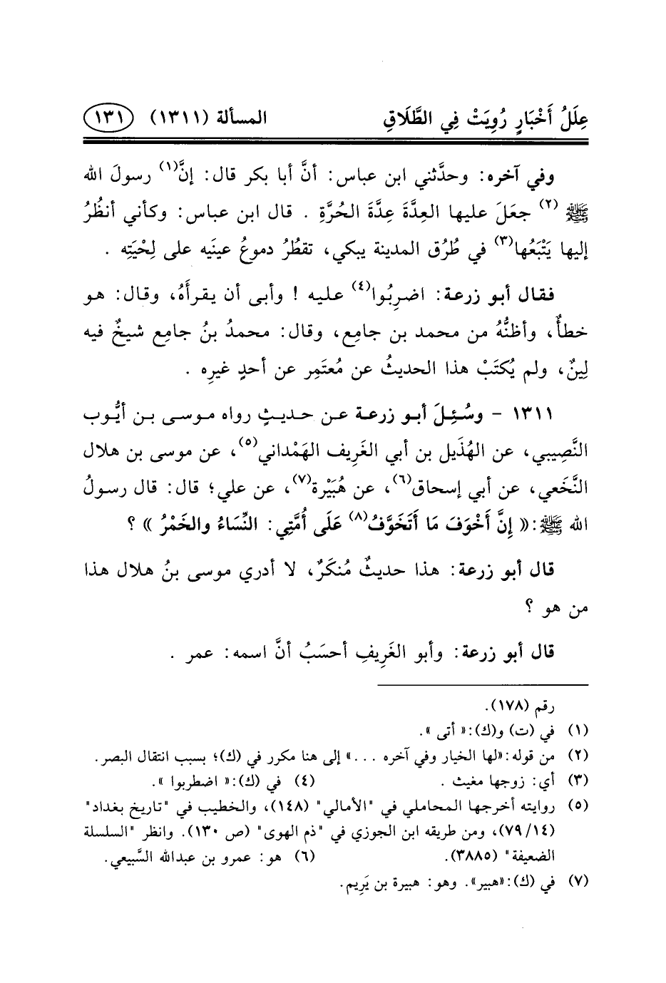 ١٣١١ - وسُئِلَ أَبُو زُرْعَةَ عَنْ حديثٍ رَوَاهُ مُوسَى بْنُ أيُّوب النَّصِيبي، عَنِ الهُذَيل بْنِ أَبِي الغَرِيف الهَمْداني (٥) ، عَنْ مُوسَى بْنِ هِلالٍ النَّخَعي، عَنْ أَبِي إِسْحَاقَ (٦) ، عَنْ هُبَيْرة (٧) ، عَنْ عَلِيٍّ؛ قَالَ: قَالَ رسولُ اللَّهِ (ص) : إِنَّ أَخْوَفَ مَا أَتَخَوَّفُ (٨) عَلَى أُمَّتِي: النِّسَاءُ والخَمْرُ؟