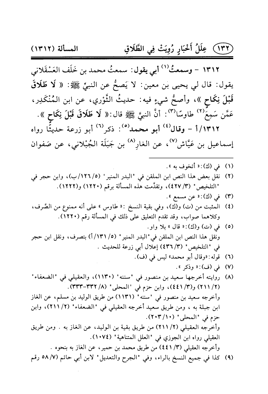 ١٣١٢ - وسمعتُ (١) أَبِي يَقُولُ: سمعتُ مُحَمَّدَ بْنَ خَلَف العَسْقَلاني يَقُولُ: قَالَ لِي يَحْيَى بْنُ مَعِينٍ: لا يَصحُّ عن النبيِّ (ص) : لَا طَلَاقَ قَبْلَ نِكَاحٍ، وأصحُّ شيءٍ فِيهِ: حديثُ الثَّوْري، عَنِ ابْنِ المُنْكَدِر، عَمَّن سَمِعَ (٢) طَاوُسًا (٣) : أنَّ النبيَّ (ص) قَالَ: لَا طَلَاقَ قَبْلَ نِكَاحٍ.