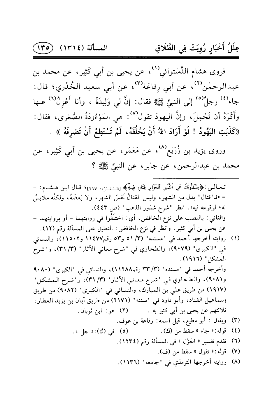 عَنْ يَحْيَى بْنِ أَبِي كَثِير، عَنْ مُحَمَّدِ بن عبد الرحمن (٢) ، عَنْ أَبِي رِفاعَة (٣) ، عَنْ أَبِي سَعِيدٍ الخُدْري؛ قَالَ: جَاءَ (٤) رجلٌ (٥) إلى النبيِّ (ص) فَقَالَ: إنَّ لِي وَلِيدَةً، وَأَنَا أَعْزِلُ (٦) عَنْهَا وأَكْرَهُ أَنْ تَحْمِلَ، وإنَّ اليهودَ تَقُولُ (٧) : هِيَ المَوْءُودَةُ الصُّغرى، فَقَالَ: كَذَبَتِ اليَهُودُ! لَوْ أَرَادَ اللهُ أَنْ يَخْلُقَهُ، لَمْ تَسْتَطِعْ أَنْ تَصْرِفَهُ.