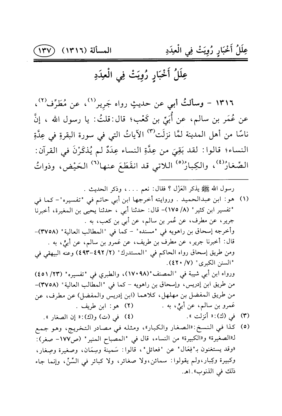عَنْ مُطَرِّف (٢) ، عَنْ عُمَر بْنِ سَالِمٍ، عَنْ أُبَيِّ بْنِ كَعْب؛ قَالَ: قلتُ: يَا رَسُولَ اللَّهِ، إنَّ نَاسًا مِنْ أَهْلِ الْمَدِينَةِ لمَّا نزلَت (٣) الآياتُ الَّتِي فِي سُورَةِ البقرةِ فِي عِدَّةِ النِّسَاءِ؛ قَالُوا: لَقَدْ بَقِيَ مِنْ عِدَّةِ النِّسَاءِ عِدَدٌ لَمْ يُذكَرْنَ في القرآن: الصِّغارُ (٤) ، والكِبارُ (٥) اللاتِي قَدِ انقَطَعَ عنها (٦) الحَيْض، وذواتُ