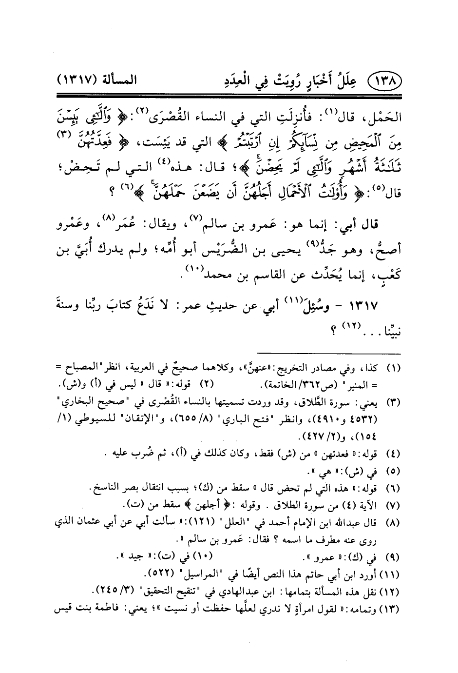 ١٣١٧ - وسُئِلَ (١١) أَبِي عَنْ حديثِ عُمَرَ: لا نَدَعُ كتابَ ربِّنا وسنةَ نبيِّنا ... (١٢) ؟