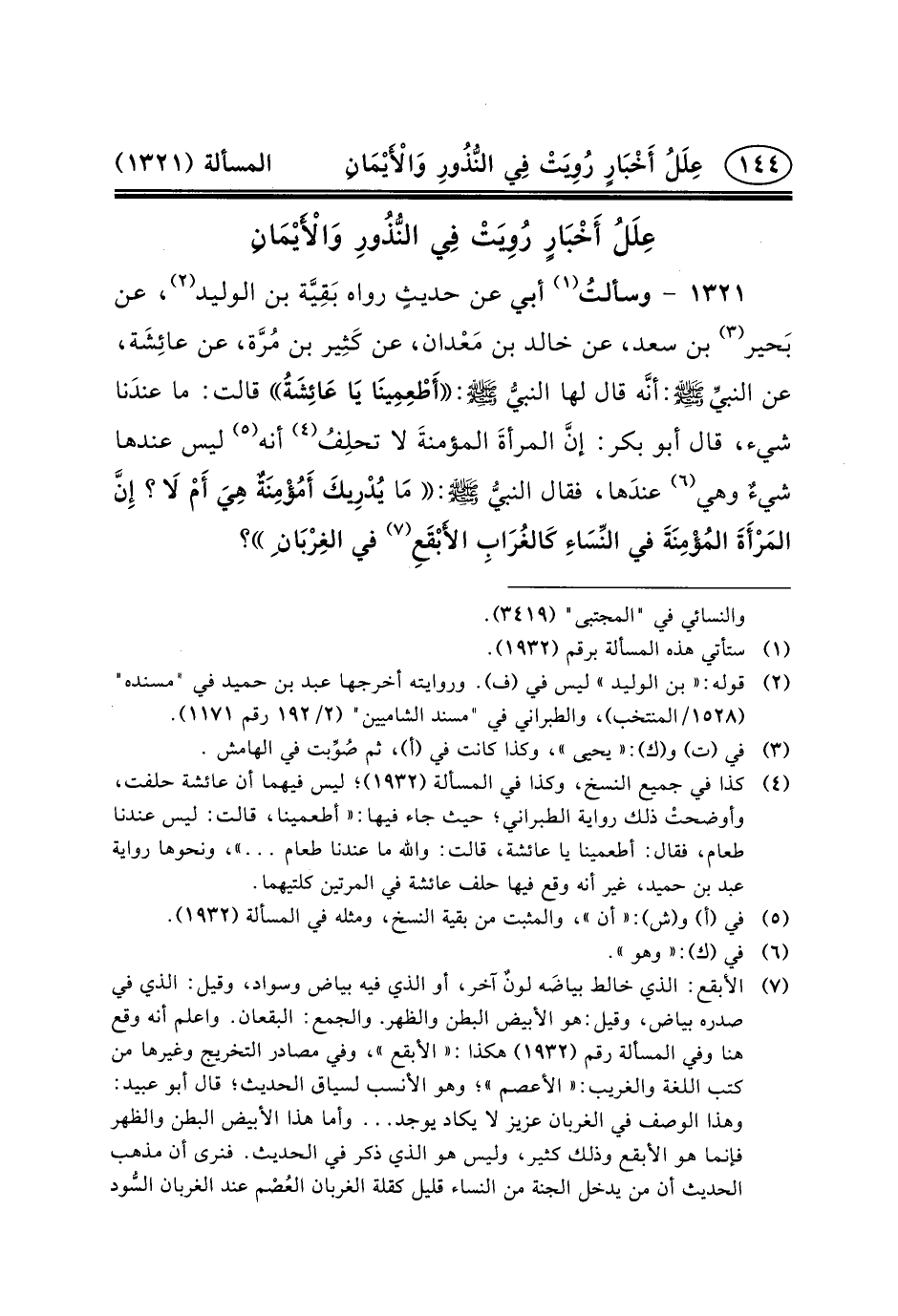 ١٣٢١ - وسألتُ (١) أَبِي عَنْ حديثٍ رَوَاهُ بَقِيَّة بْنُ الْوَلِيدِ (٢) ، عَنْ بَحير (٣) بْنِ سَعْدٍ، عَنْ خَالِدِ بْنِ مَعْدان، عَنْ كَثِير بْنِ مُرَّة، عَنْ عائِشَة، عَنِ النبيِّ (ص) : أنَّه قال لها النبيُّ (ص) : أَطْعِمِينَا يَا عَائِشَةُ قَالَتْ: مَا عندَنا شَيْءٌ، قَالَ أَبُو بَكْرٍ: إنَّ المرأةَ المؤمنةَ لا تحلِفُ (٤) أَنَّهُ (٥) لَيْسَ عِنْدَهَا شيءٌ وَهِيَ (٦) عندَها، فقال النبيُّ (ص) : مَا يُدْرِيكَ أَمُؤْمِنَةٌ هِيَ أَمْ لَا؟ إِنَّ المَرْأَةَ المُؤْمِنَةَ فِي النِّسَاءِ كَالغُرَابِ الأَبْقَعِ (٧)