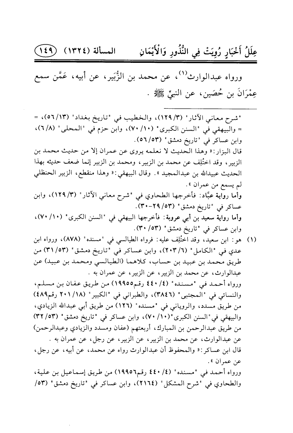 ورواه أحمد في "مسنده" (٤/٤٤٠ رقم١٩٩٥٥) من طريق عفان بن مسلم، والنسائي في "المجتبى" (٣٨٤٦) ، والطبراني في "الكبير" (١٨/٢٠١ رقم٤٨٩) من طريق مسدد، والروياني في "مسنده" (١٢٦) من طريق أبي عبد الله الزيادي، والبيهقي في"السنن الكبرى" (١٠/٧٠) ، وابن عساكر في "تاريخ دمشق" (٥٣/٣٢) من طريق عبد الرحمن بن المبارك، أربعتهم (عفان ومسدد والزيادي وعبد الرحمن) عن عبد الوارث، عَنْ مُحَمَّدِ بْنِ الزُّبَيْرِ، عَنْ الزبير، عن رجل، عن عمران به.