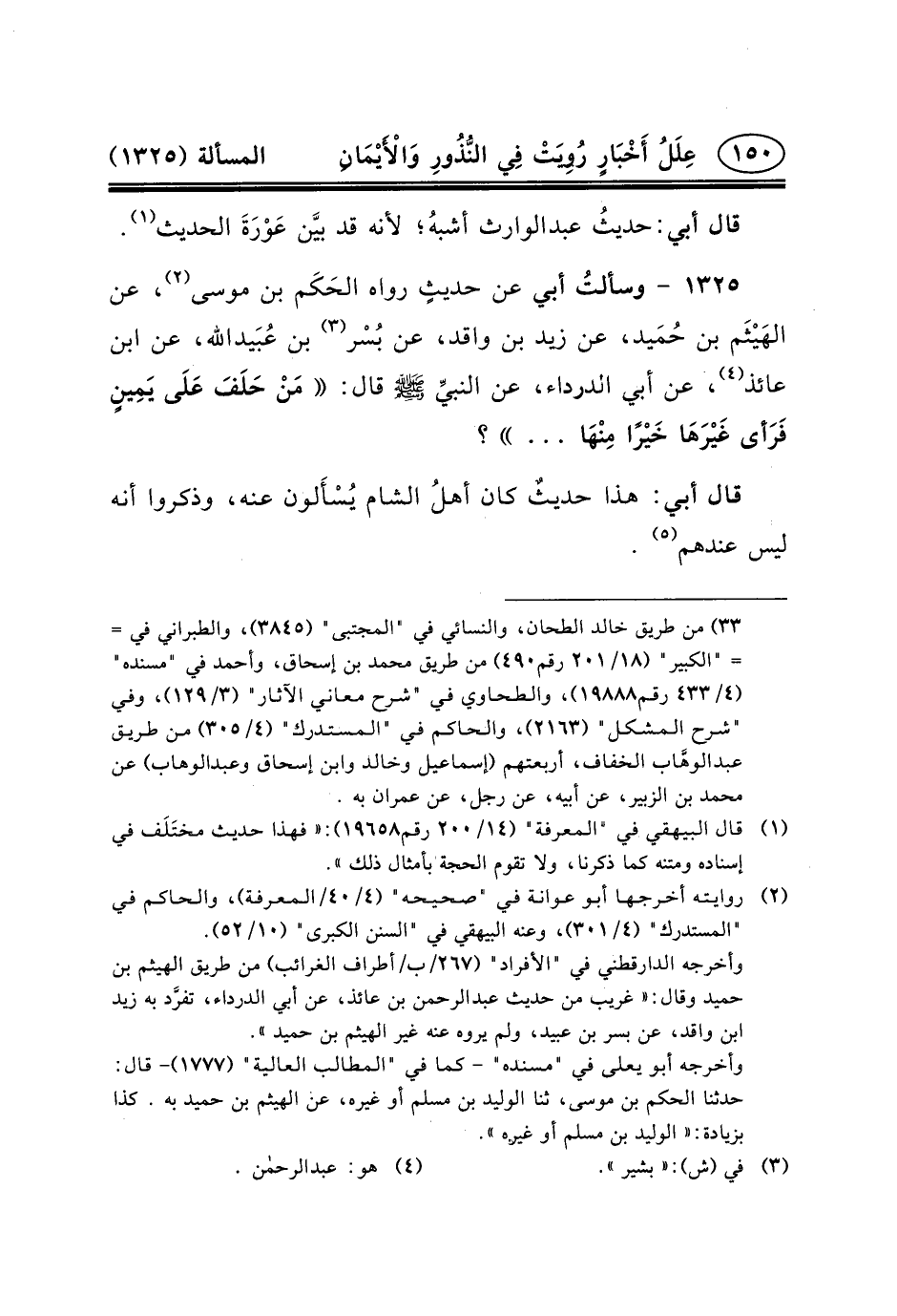 ١٣٢٥ - وسألتُ أَبِي عَنْ حديثٍ رَوَاهُ الحَكَم بْنُ مُوسَى (٢) ، عَنِ الهَيْثَم بْنِ حُمَيد، عَنْ زَيْدِ بْنِ وَاقِدٍ، عَنْ بُسْر (٣) بْنِ عُبَيدالله، عَنِ ابْنِ عَائِذٍ (٤) ، عَنْ أَبِي الدرداء، عن النبيِّ (ص) قَالَ: مَنْ حَلَفَ عَلَى يَمِينٍ فَرَأى غَيْرَهَا خَيْرًا مِنْهَا ... ؟