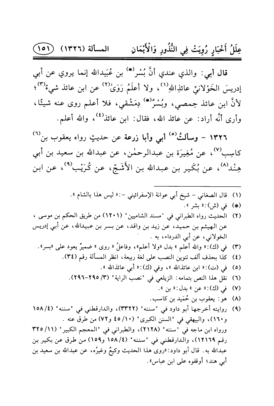 قَالَ أَبِي: وَالَّذِي عِنْدِي أنَّ بُسْر (*) بن عُبَيدالله إِنَّمَا يَرْوِي عَنْ أَبِي إدريسَ الخَوْلانيِّ عائذِاللهِ (١) ، وَلا أعلَمُ رَوَى (٢) عَنِ ابْنِ عائذ شيءً (٣) ؛ لأنَّ ابْنَ عَائِذٍ حِمصي، وبُسْرٌ (*) دِمَشْقي، فَلا أَعْلَمُ رَوَى عَنْهُ شَيْئًا، وَأَرَى أنَّه أَرَادَ: عَنْ عَائِذِ اللَّهِ، فَقَالَ: ابْنُ عَائِذٍ (٤) ، وَاللَّهُ أَعْلَمُ.