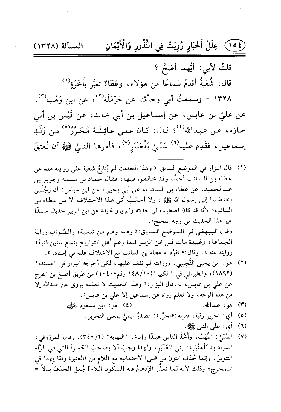 ١٣٢٨ - وسمعتُ أَبِي وحدَّثنا عَنْ حَرْمَلَة (٢) ، عَنِ ابْنِ وَهْب (٣) ، عَنْ عليِّ بْنِ عَابِسٍ، عَنْ إِسْمَاعِيلَ بْنِ أَبِي خَالِدٍ، عَن قَيْس بْنِ أَبِي حَازِمٍ، عن عبد الله (٤) ؛ قَالَ: كَانَ عَلَى عائِشَة مُحَرَّرٌ (٥) مِنْ وَلَدِ إِسْمَاعِيلَ، فقَدِم عَلَيْهِ (٦) سَبْيُ بَلْعَنْبَرِ (٧) ، فأمرها النبيُّ (ص) أن تُعتِقَ