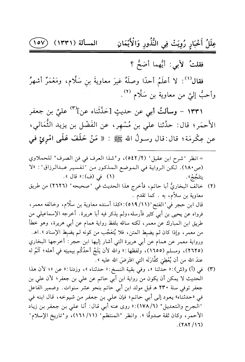 ١٣٣١ - وسألتُ أَبِي عَنْ حديثٍ [حَدَّثَناه عن] (٣) عليِّ بْنُ جَعْفَرٍ الأَحمَر؛ قَالَ: حدَّثنا عَلِيُّ بْنُ مُسْهِر، عَنِ الفَضْل بْنِ يَزِيدَ الثُّمَالي، عَنْ عِكْرمَة؛ قَالَ: قَالَ رسولُ اللَّهِ (ص) : مَنْ حَلَفَ عَلَى امْرِئٍ فِي