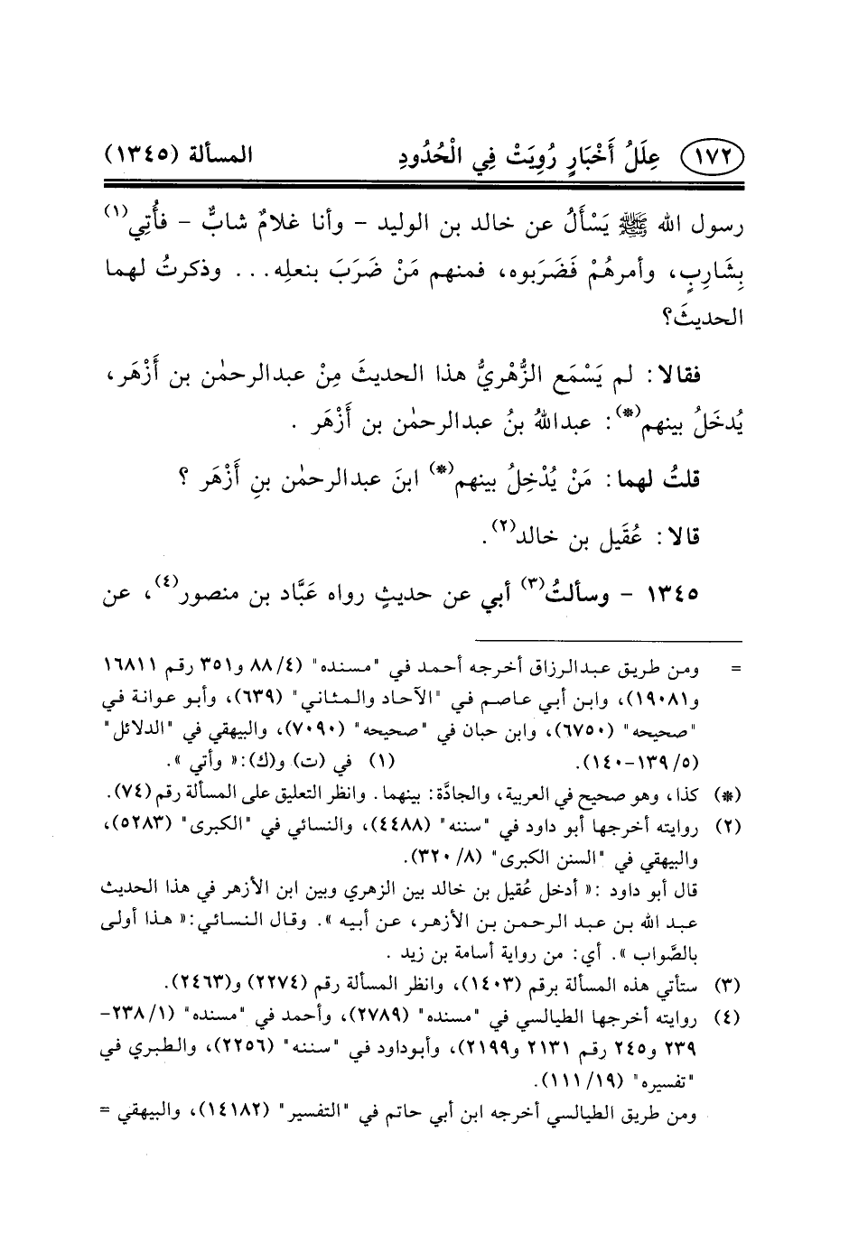 فَقَالا: لَمْ يَسْمَع الزُّهْريُّ هَذَا الحديثَ مِنْ عبد الرحمن بن أَزْهَر، يُدخَلُ بينهم (*) : عبد اللهُ ابنُ عبد الرحمن بْنِ أَزْهَر.