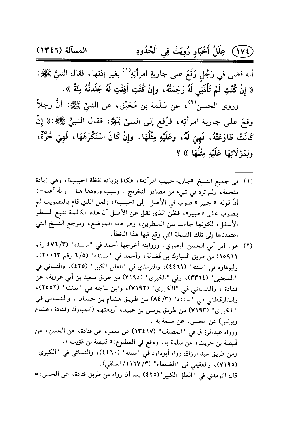 (١) في جميع النسخ: «جارية حبيب امرأته» ، هكذا بزيادة لفظة «حبيب» ، وهي زيادة مقحمة، ولم ترد في شيء من مصادر التخريج. وسبب ورودها هنا - والله أعلم-: أنَّ قوله: «جبير» صوب في الأصل إلى «حبيب» ، ولعل الذي قام بالتصويب لم يضرب على «جبير» ، فظن الذي نقل عن الأصل أن هذه الكلمة تتبع السطر الأسفل؛ لكونها جاءت بين السطرين، وهو هذا الموضع، ومرجع النُّسخ التي اعتمدناها إلى تلك النسخة التي وقع فيها هذا الخطأ.