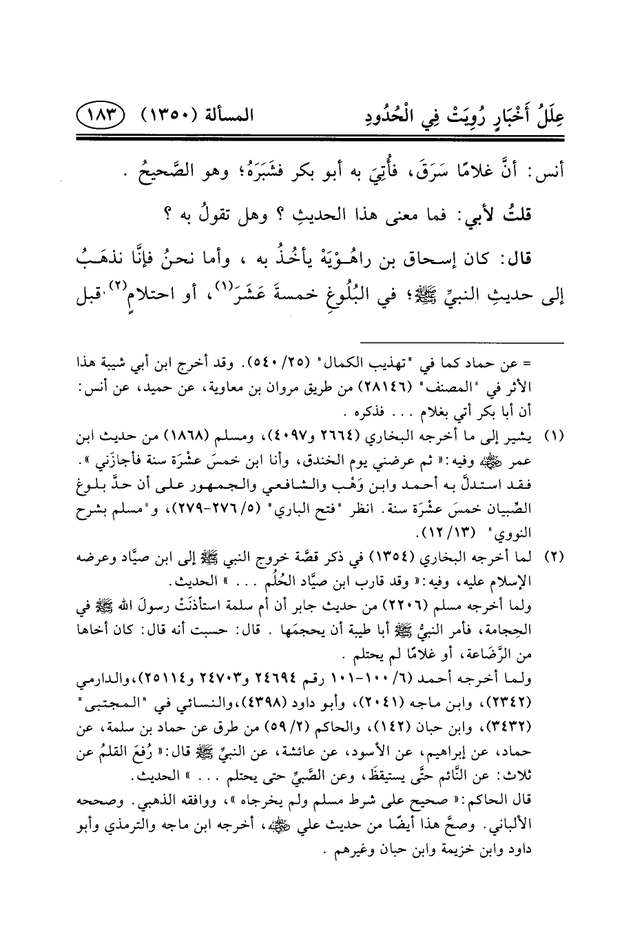 قَالَ: كَانَ إِسْحَاقُ بْنُ راهُوْيَهْ يأخُذُ بِهِ، وَأَمَّا نحنُ فإنَّا نذهَبُ إلى حديثِ النبيِّ (ص) ؛ فِي البُلُوغِ خمسةَ عَشَرَ (١) ، أَوِ احتلامٍ (٢)