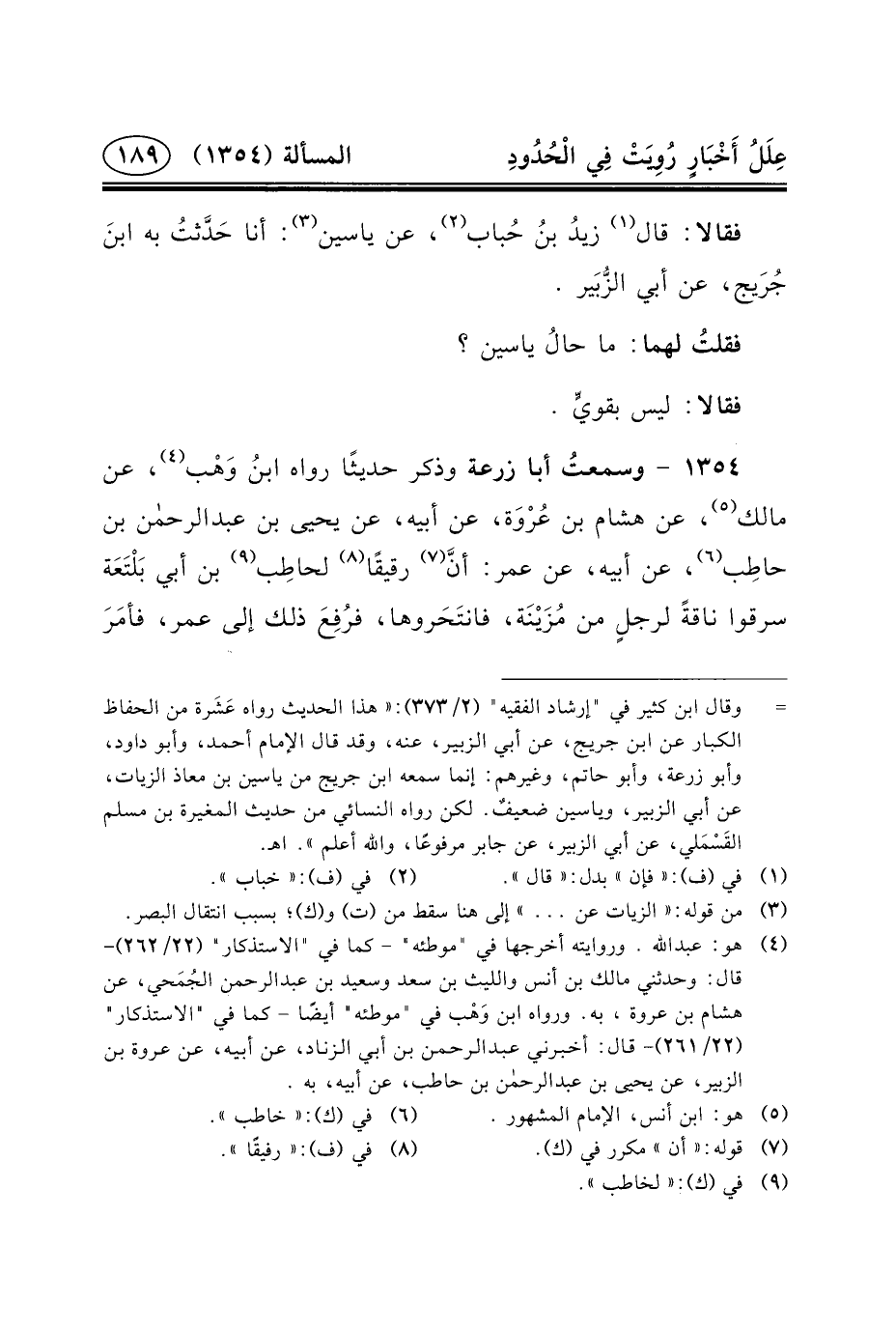 ١٣٥٤ - وسمعتُ أَبَا زُرْعَةَ وَذَكَرَ حَدِيثًا رَوَاهُ ابنُ وَهْب (٤) ، عَنْ مَالِكٍ (٥) ، عَنْ هِشَامِ بْنِ عُرْوَة، عَنْ أَبِيهِ، عَنْ يحيى بن عبد الرحمن بْنِ حاطِب (٦) ، عَنْ أَبِيهِ، عَنْ عُمَرَ: أنَّ (٧) رَقِيقًا (٨) لحاطِب (٩) بْنِ أَبِي بَلْتَعَة سَرَقُوا نَاقَةً لرجلٍ مِنْ مُزَيْنَة، فانتَحَروها، فرُفِعَ ذَلِكَ إلى عمر، فأمَرَ