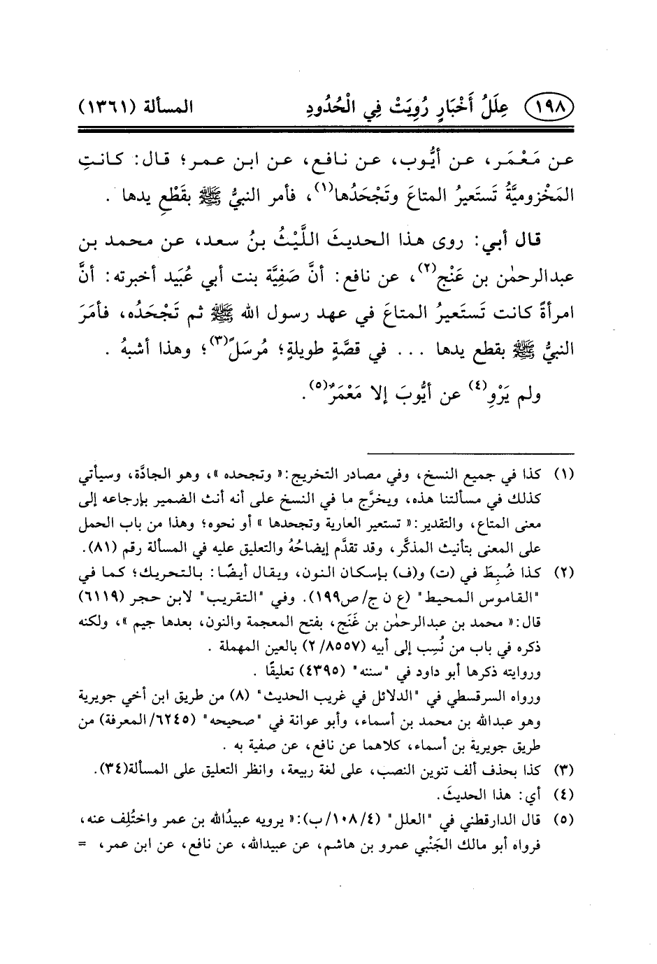 قَالَ أَبِي: رَوَى هَذَا الحديثَ اللَّيْثُ بنُ سَعْدٍ، عن محمد بن عبد الرحمن بن عَنْج (٢) ، عَنْ نَافِعٍ: أنَّ صَفِيَّة بِنْتَ أَبِي عُبَيد أَخْبَرَتْهُ: أنَّ امْرَأَةً كَانَتْ تَستَعيرُ المتاعَ فِي عَهْدِ رسول الله (ص) ثم تَجْحَدُه، فأمَرَ النبيُّ (ص) بِقَطْعِ يَدِهَا ... فِي قصَّةٍ طويلةٍ؛ مُرسَلً (٣) ؛ وَهَذَا أشبهُ.