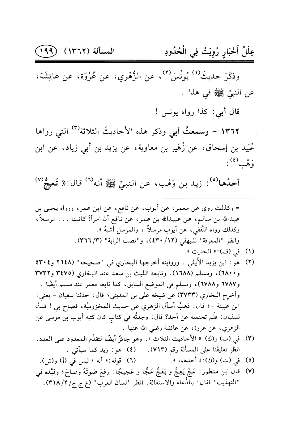 ١٣٦٢ - وسمعتُ أَبِي وَذَكَرَ هَذِهِ الأحاديثَ الثَّلاثَةَ (٣) الَّتِي رَوَاهَا عُبَيد بْنُ إِسْحَاقَ، عَنْ زُهَير ابن مُعَاوِيَةَ، عَنْ يَزِيدَ بْنِ أَبِي زِيَادٍ، عَنِ ابْنِ وَهْب (٤) :