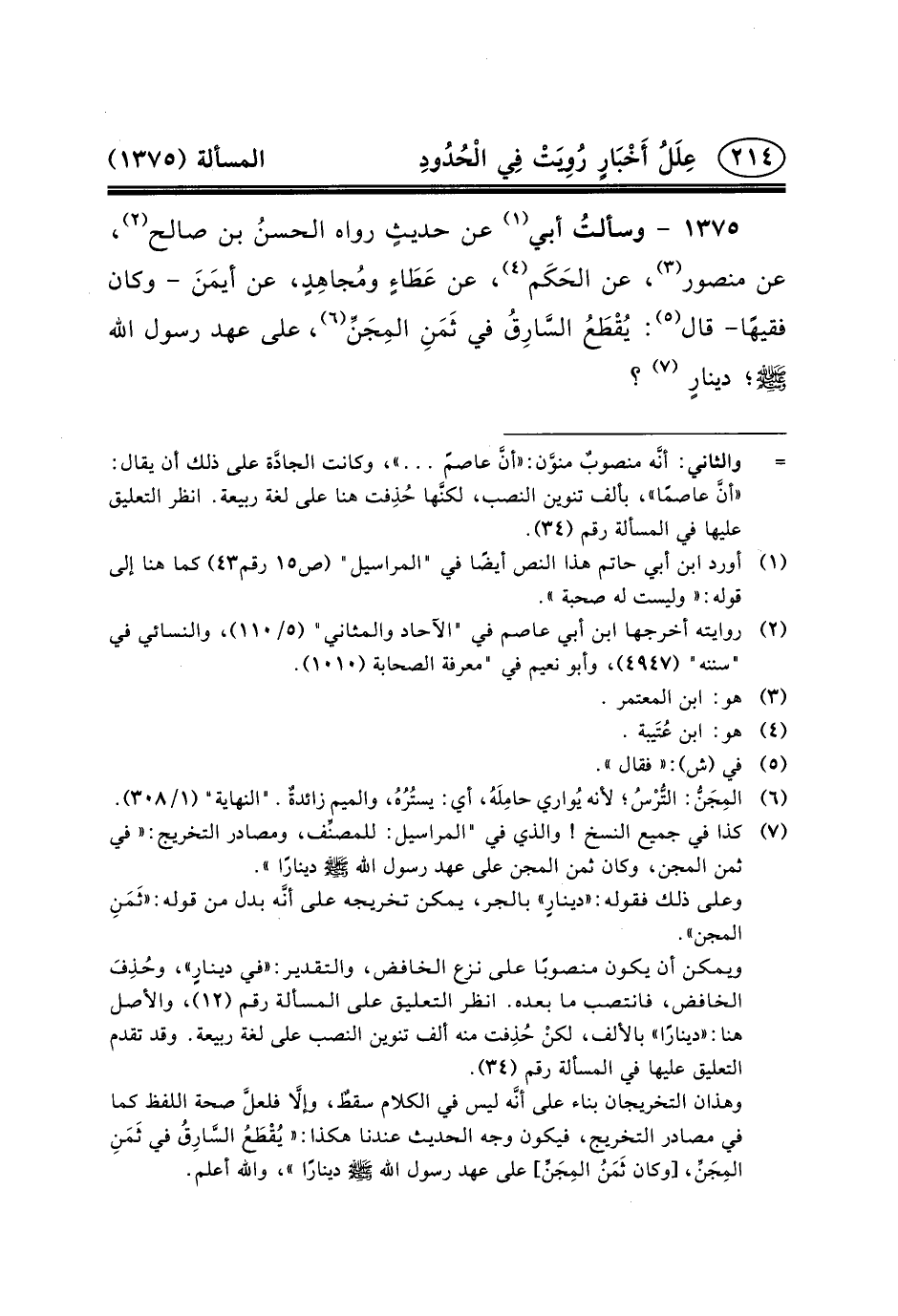 ١٣٧٥ - وسألتُ أَبِي (١) عَنْ حديثٍ رَوَاهُ الحسنُ بْنُ صَالِحٍ (٢) ، عَنْ مَنْصُورٍ (٣) ، عَنِ الحَكَم (٤) ، عَنْ عَطَاءٍ ومُجاهِدٍ، عَنْ أيمَنَ - وَكَانَ فَقِيهًا- قَالَ (٥) : يُقْطَعُ السَّارِقُ فِي ثَمَنِ المِجَنِّ (٦) ، على عهد رسول الله (ص) ؛ دينارٍ (٧) ؟