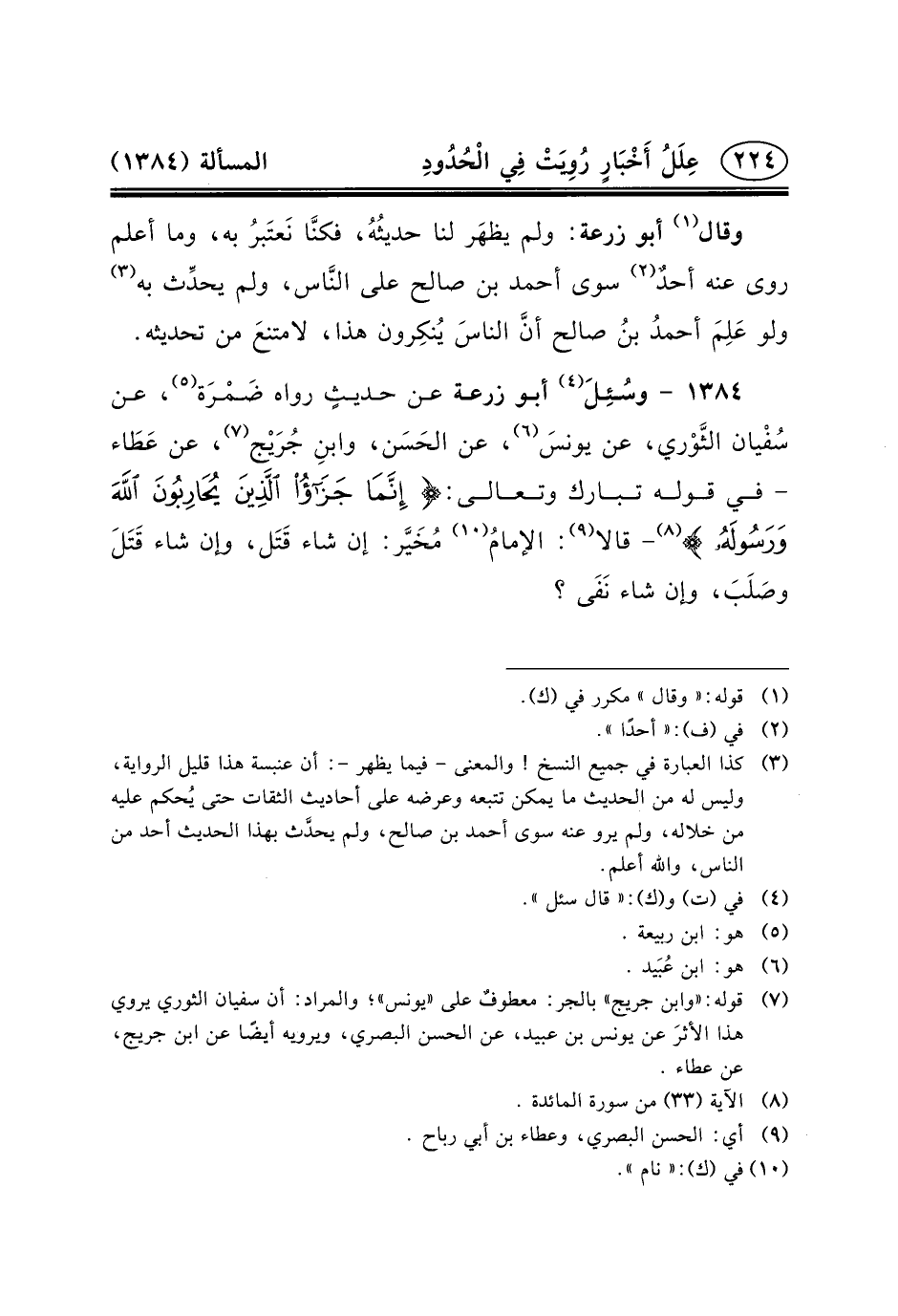 ١٣٨٤- وسُئِلَ (٤) أَبُو زُرْعَةَ عَنْ حديثٍ رَوَاهُ ضَمْرَة (٥) ، عَنْ سُفْيان الثَّوْري، عَنْ يونسَ (٦) ، عَنِ الحَسَن، وابنِ جُرَيْج (٧) ، عَنْ عَطَاء - فِي قَوْلِهِ تَبَارَكَ وَتَعَالَى: {إِنَّمَا جَزَاءُ الَّذِينَ يُحَارِبُونَ اللَّهَ وَرَسُولَهُ} (٨) - قالا (٩) : الإمامُ (١٠) مُخَيَّر: إِنْ شَاءَ قَتَل، وَإِنْ شَاءَ قَتَلَ وصَلَبَ، وَإِنْ شاء نَفَى؟
