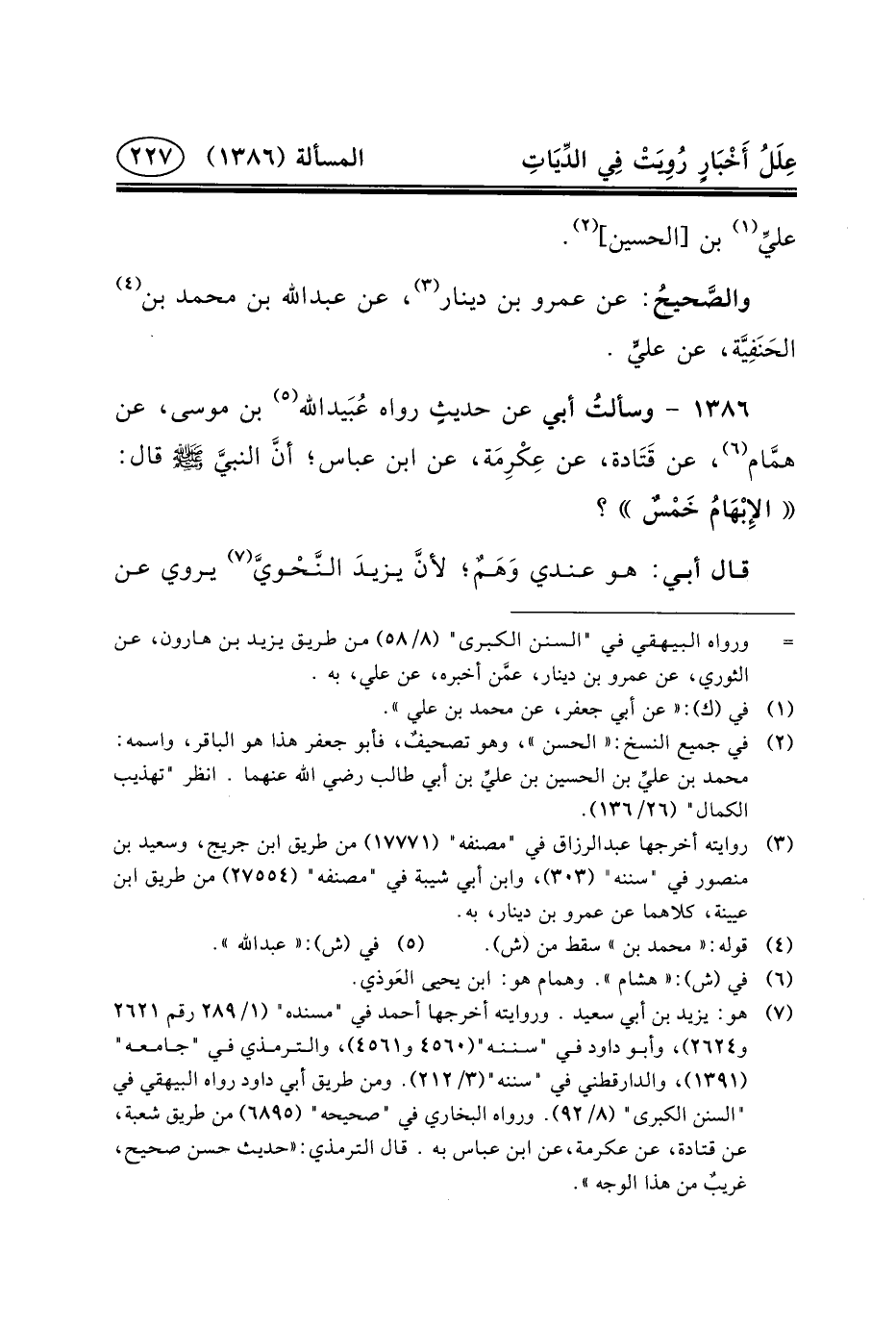 ١٣٨٦ - وسألتُ أَبِي عَنْ حديثٍ رواه عُبَيدالله (٥) بْنُ مُوسَى، عَنْ همَّام (٦) ، عَنْ قَتَادة، عَنْ عِكْرِمَة، عَنِ ابْنِ عباس؛ أنَّ النبيَّ (ص) قال: الإِبْهَامُ خَمْسٌ؟