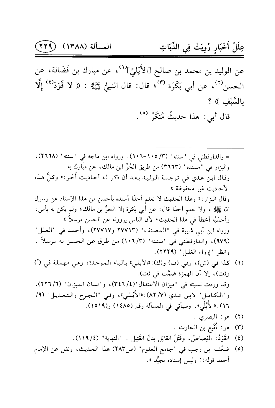 عن الوليد بن محمد ابن صالح [الأَيْليِّ] (١) ، عَن مبارك بْن فَضَالة، عَن الْحَسَنِ (٢) ، عَنْ أَبِي بَكْرَة (٣) ؛ قَالَ: قال النبيُّ (ص) : لا قَوَدَ (٤) إِلَاّ بالسَّيْفِ؟
