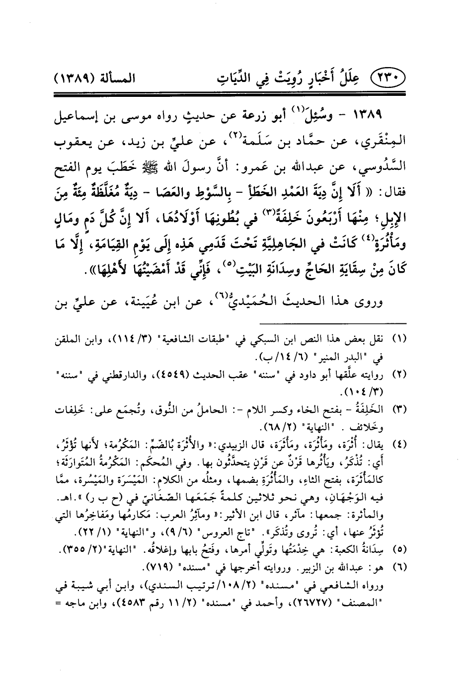 ١٣٨٩ - وسُئِلَ (١) أَبُو زُرْعَةَ عَنْ حديثٍ رَوَاهُ مُوسَى بْنُ إِسْمَاعِيلَ المِنْقَري، عن حمَّاد ابن سَلَمة (٢) ، عَنْ عليِّ بْنِ زَيْدٍ، عن يعقوب السَّدُوسي، عن عبد الله بْنِ عَمرو: أنَّ رسولَ اللَّهِ (ص) خَطَبَ يَوْمَ الْفَتْحِ فَقَالَ: أَلَا إِنَّ دِيَةَ العَمْدِ الخَطَأِ - بِالسَّوْطِ والعَصَا - دِيَةٌ مُغَلَّظَةٌ مِئَةٌ مِنَ الإِبِلِ؛ مِنْهَا أَرْبَعُونَ خَلِفَةً (٣) فِي بُطُونِهَا أَوْلَادُهَا، أَلا إِنَّ كُلَّ دَمٍ ومَالٍ ومَأْثُرَةٍ (٤) كَانَتْ فِي الجَاهِلِيَّةِ تَحْتَ قَدَمِي هَذِه إِلَى يَوْمِ القِيَامَةِ، إِلَاّ مَا كَانَ مِنْ سِقَايَةِ الحَاجِّ وسِدَانَةِ البَيْتِ (٥) ،