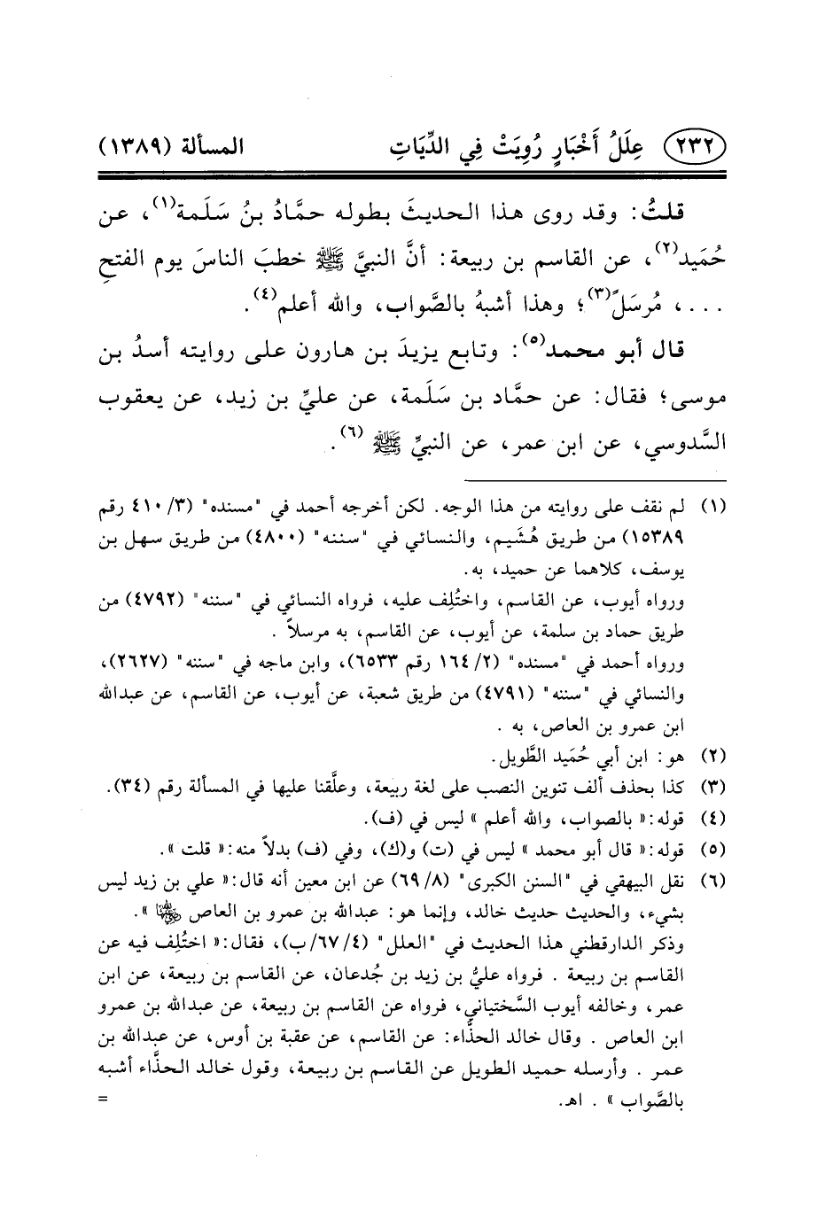 قلتُ: وقد روى هَذَا الحديثَ بطوله حمَّادُ ابنُ سَلَمة (١) ، عَنْ حُمَيد (٢) ، عَنِ الْقَاسِمِ بن ربيعة: أنَّ النبيَّ (ص) خطبَ الناسَ يَوْمَ الفتحِ ... ، مُرسَلً (٣) ؛ وَهَذَا أشبهُ بالصَّواب، وَاللَّهُ أَعْلَمُ (٤) .