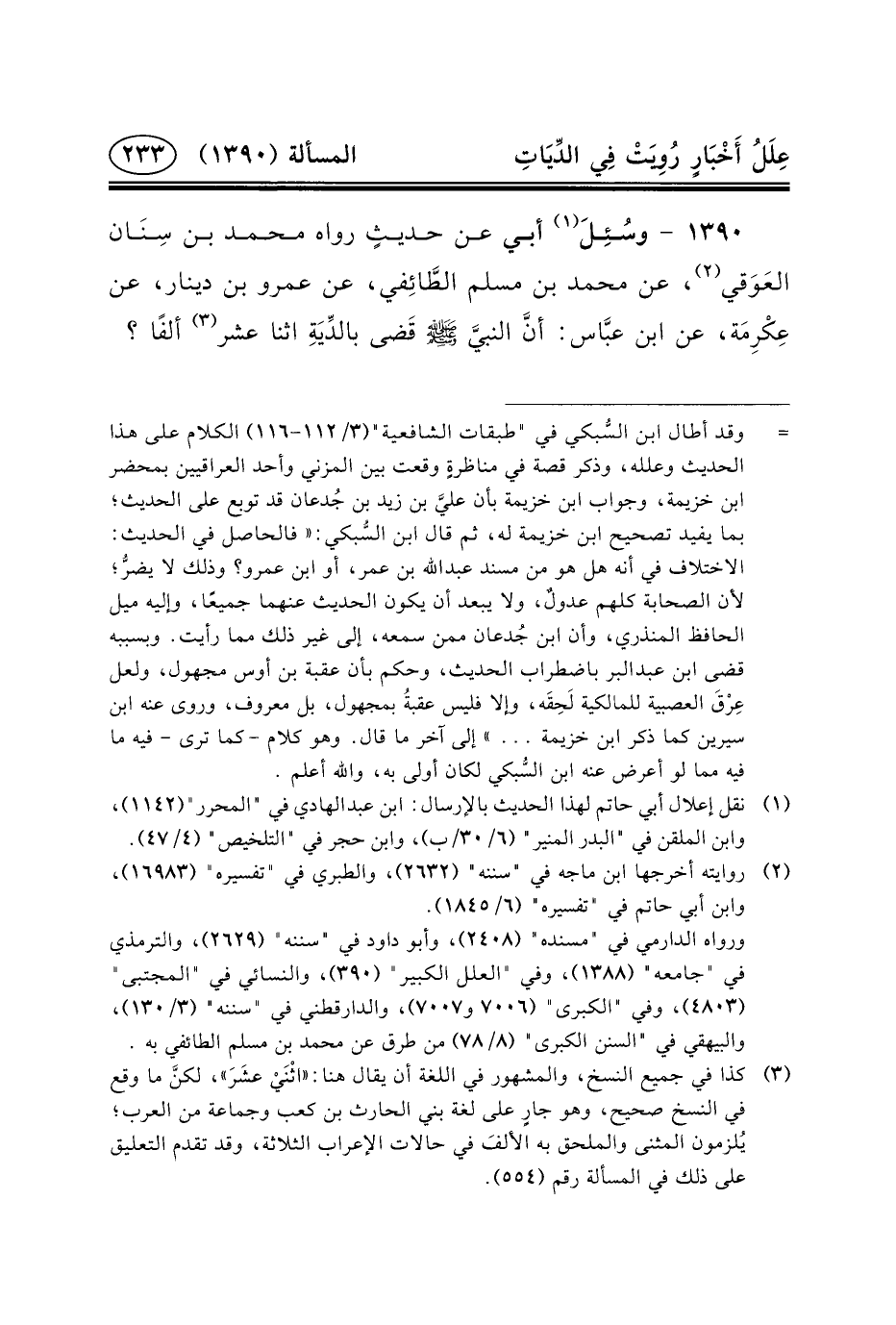 ١٣٩٠ - وسُئِلَ (١) أَبِي عَنْ حديثٍ رَوَاهُ مُحَمَّدُ بْنُ سِنَان العَوَقي (٢) ، عَنْ مُحَمَّدِ بْنِ مُسْلِمٍ الطَّائِفي، عَنْ عَمْرِو بْنِ دِينَارٍ، عَنْ عِكْرِمَة، عَنِ ابْنِ عبَّاس: أنَّ النبيَّ (ص) قَضى بالدِّيَةِ اثنا عشر (٣) ألفًا؟