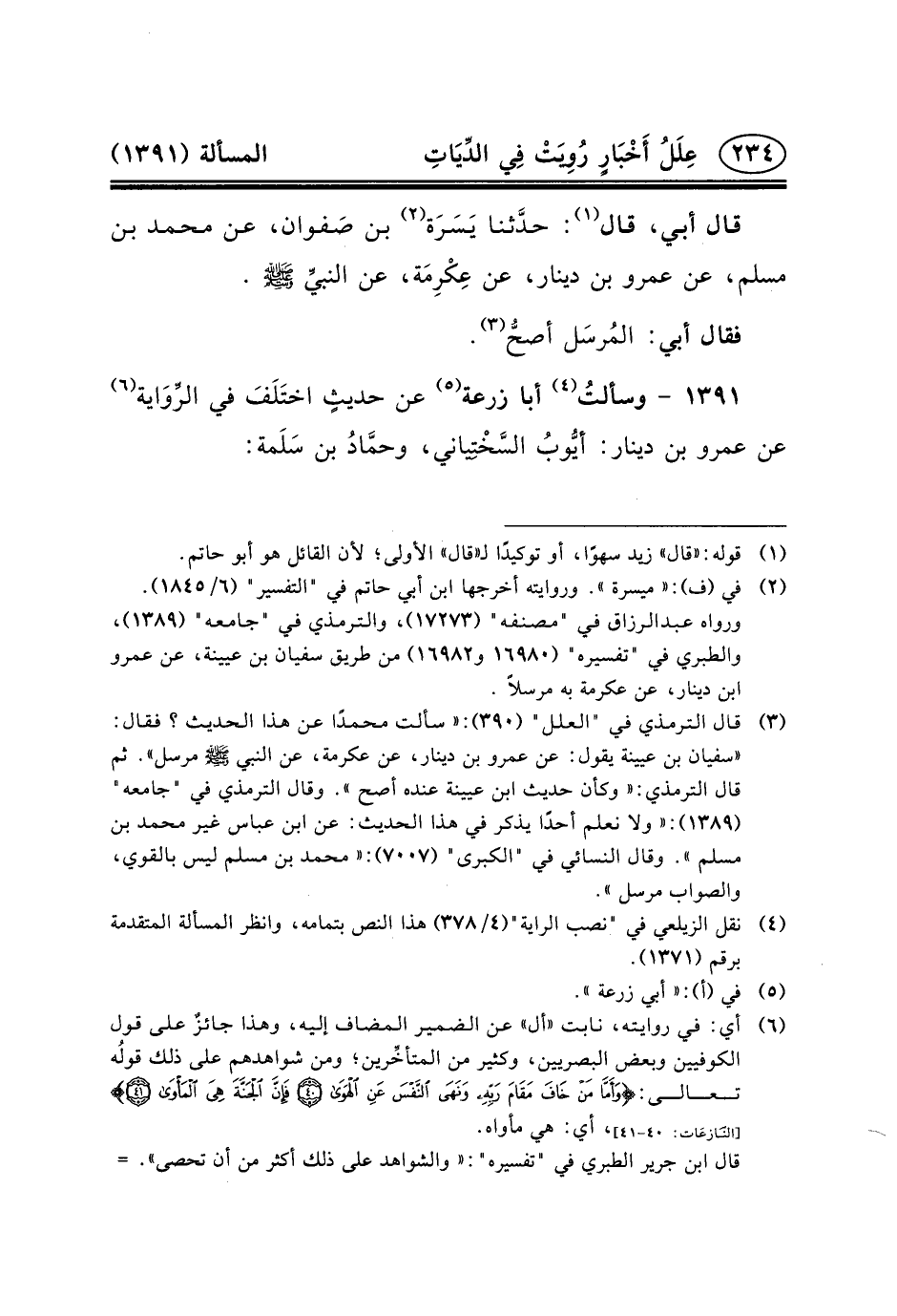 ١٣٩١ - وسألتُ (٤) أَبَا زُرْعَةَ (٥) عَنْ حديثٍ اختَلَفَ فِي الرِّوَاية (٦) عَنْ عَمْرِو بْنِ دِينَارٍ: أيُّوبُ السَّخْتِياني، وحمَّادُ بْنُ سَلَمة: