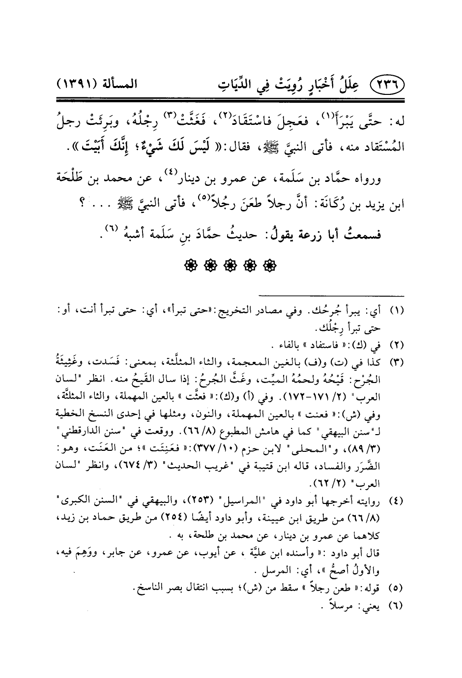 وَرَوَاهُ حمَّاد بْنُ سَلَمة، عَنْ عَمْرِو بْنِ دِينَارٍ (٤) ، عَنْ مُحَمَّدِ بْنِ طَلْحَة بْنِ يَزِيدَ بْنِ رُكَانَة: أنَّ رَجُلا طعَنَ رجُلاً (٥) ، فأتى النبيَّ (ص) ... ؟