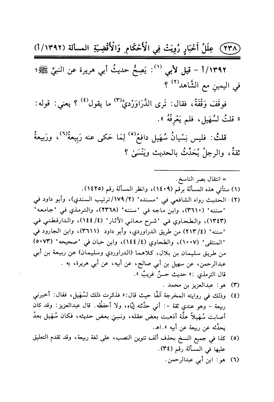 ١٣٩٢/أ - قِيلَ لأَبِي (١) : يَصِحُّ حديثُ أَبِي هريرة عن النبيِّ (ص) ؛ فِي اليمينِ مَعَ الشَّاهد (٢) ؟