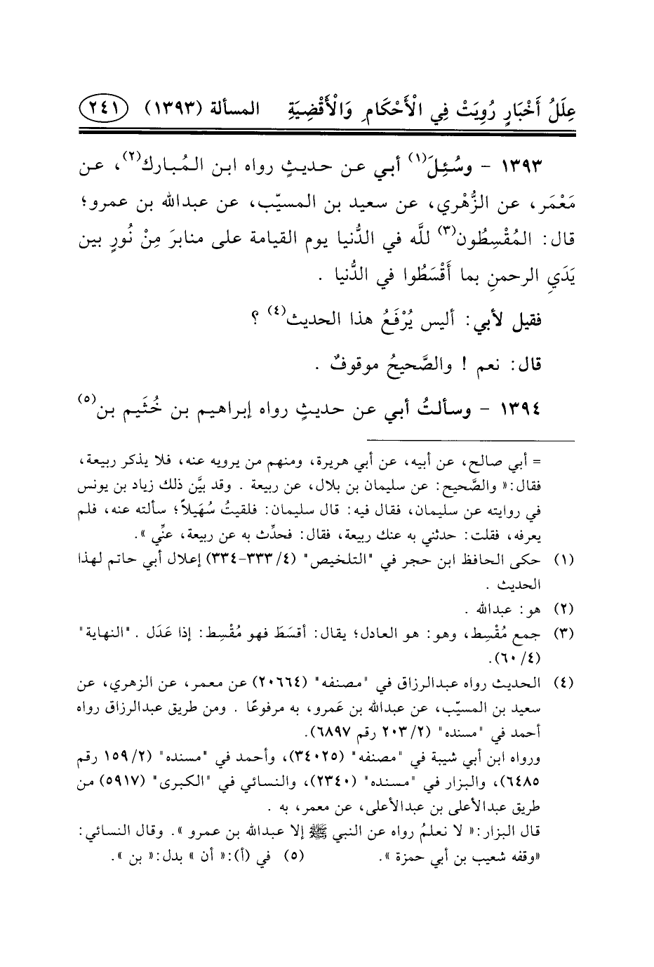١٣٩٣ - وسُئِلَ (١) أَبِي عَنْ حديثٍ رَوَاهُ ابْنُ المُبارك (٢) ، عَنْ مَعْمَر، عَنِ الزُّهْري، عَنْ سَعِيدِ بْنِ الْمُسَيِّبِ، عن عبد الله بْنِ عَمْرٍو؛ قَالَ: المُقْسِطُون (٣) للَّه فِي الدُّنيا يَوْمَ الْقِيَامَةِ عَلَى منابرَ مِنْ نُورٍ بَيْنَ يَدَيِ الرحمنِ بِمَا أَقْسَطُوا فِي الدُّنيا.