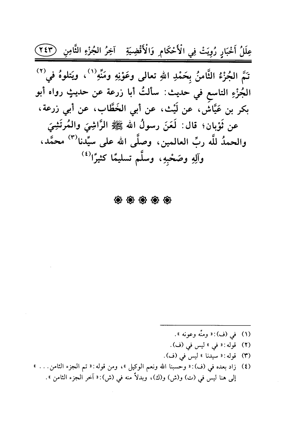 .. تَمَّ الجُزْءُ الثَّامنُ بِحَمْدِ اللهِ تعالى وعَوْنِهِ ومَنِّهِ (١) ، ويَتلوهُ في (٢) الجُزْءِ التاسعِ في حديث: سألتُ أَبَا زُرْعَةَ عْنَ حديثٍ رواه أبو بكر ابن عَيَّاش، عَنْ لَيْث، عَنْ أَبِي الخَطَّاب، عَنْ أَبِي زُرْعَةَ، عَنْ ثَوْبان؛ قَالَ: لَعَنَ رسولُ اللَّهِ (ص) الرَّاشِيَ والمُرتَشِيَ والحمدُ للَّه ربِّ العالمين، وصلَّى اللَّهُ عَلَى سيِّدنا (٣) محمَّد، وآلِهِ وصَحْبِهِ، وسلَّم تسليمًا كثيرًا (٤)