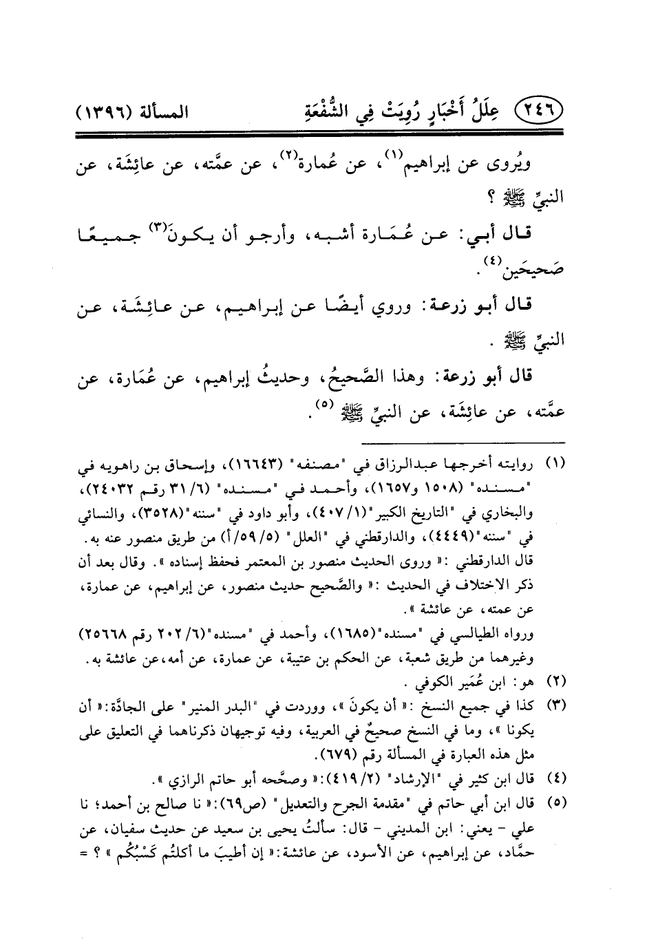 قَالَ أَبُو زُرْعَةَ: وَهَذَا الصَّحيحُ، وحديثُ إِبْرَاهِيمَ، عَنْ عُمَارة، عَنْ عمَّته، عَنْ عائِشَة، عَنِ النبيِّ (ص) (٥) .