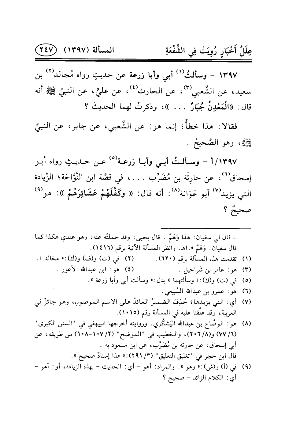 ١٣٩٧/أ - وسألتُ أَبِي وَأَبَا زُرْعَةَ (٥) عَنْ حديثٍ رَوَاهُ أَبُو إِسْحَاقَ (٦) ، عَنْ حارِثَة بْنِ مُضَرِّب ... ، فِي قصَّة ابْنِ النَّوَّاحَة؛ الزِّيادة الَّتِي يَزِيدُ (٧) أَبُو عَوَانة (٨) :