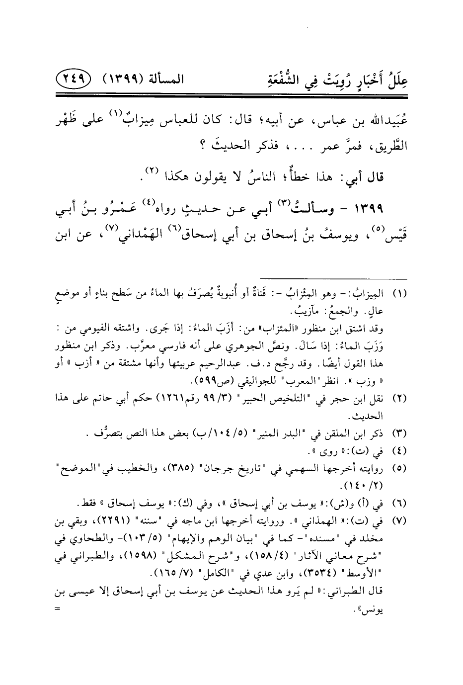 ١٣٩٩ - وسألتُ (٣) أَبِي عَنْ حديثٍ رَوَاهُ (٤) عَمْرُو بنُ أَبِي قَيْس (٥) ، ويوسفُ بنُ إِسْحَاقَ بْنِ أَبِي إِسْحَاقَ (٦) الهَمْداني (٧) ،