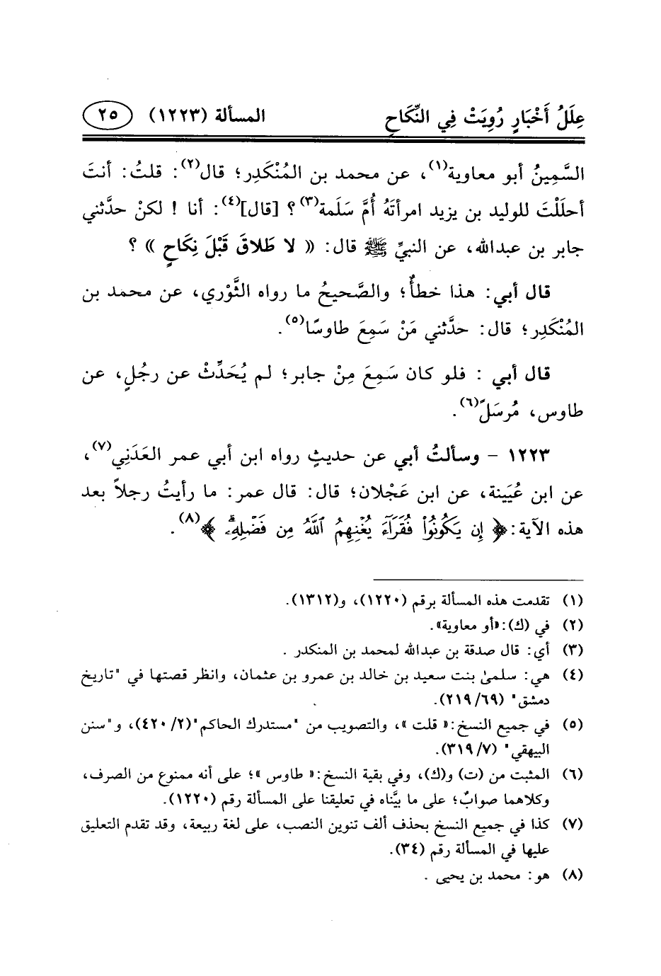 السَّمِينُ أَبُو مُعَاوِيَةَ (١) ، عَنْ مُحَمَّدِ بْنِ المُنْكَدِر؛ قَالَ (٢) : قلتُ: أنتَ أحلَلْتَ لِلْوَلِيدِ بْنِ يَزِيدَ امرأتَهُ أُمَّ سَلَمة (٣) ؟ [قال] (٤) : أَنَا! لكنْ حدَّثني جَابِرُ بْنُ عبد الله، عن النبيِّ (ص) قَالَ: لا طَلاقَ قَبْلَ نِكَاحٍ؟