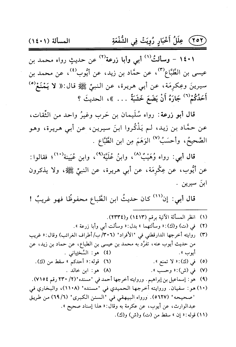 ١٤٠١ - وسألتُ (١) أَبِي وَأَبَا زُرْعَةَ (٢) عَنْ حديثٍ رَوَاهُ مُحَمَّدُ بْنُ عِيسَى بْنِ الطَّبَّاع (٣) ، عَنْ حمَّاد بْنِ زَيْدٍ، عَنْ أيُّوب (٤) ، عَنْ مُحَمَّدِ بْنِ سيرينَ وعِكرِمَة، عَنْ أَبِي هريرة، عن النبيِّ (ص) قَالَ: لا يَمْنَعْ (٥) أَحَدُكُمْ (٦) جَارَهُ أَنْ يَضَعَ خَشَبَةً ... ، الحديثَ؟