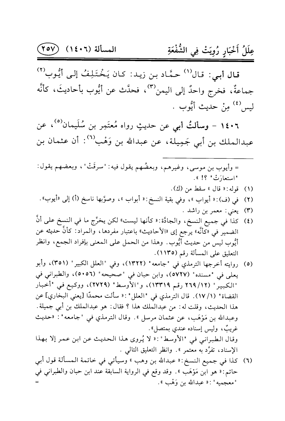 ١٤٠٦ - وسألتُ أَبِي عن حديثٍ رواه مُعتَمِر ابن سُلَيمان (٥) ، عن عبد الملك بن أبي جَمِيلة، عن عبد الله بْنِ وَهْب (٦) :
