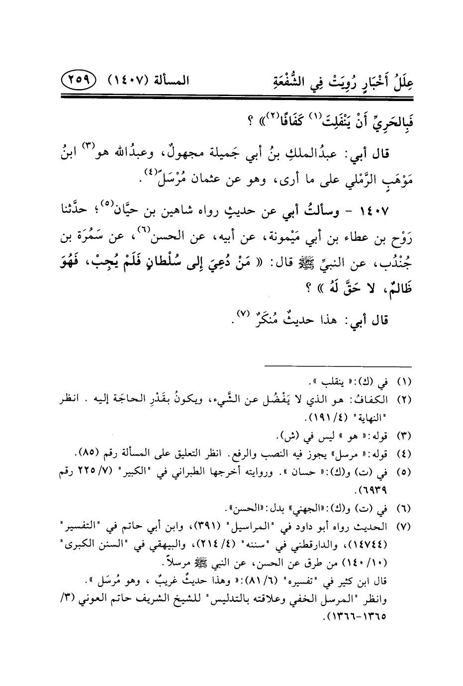 ١٤٠٧ - وسألتُ أَبِي عَنْ حديثٍ رَوَاهُ شَاهِينُ بْنُ حيَّان (٥) ؛ حدَّثنا رَوْح بْنُ عَطَاءِ بْنِ أَبِي مَيْمونة، عَنْ أَبِيهِ، عَنِ الْحَسَنِ (٦) ، عَنْ سَمُرَة بْنِ جُنْدُب، عَنِ النبيِّ (ص) قَالَ: مَنْ دُعِيَ إِلى سُلْطانٍ فَلَمْ يُجِبْ، فَهُوَ ظَالمٌ، لا حَقَّ لَهُ؟