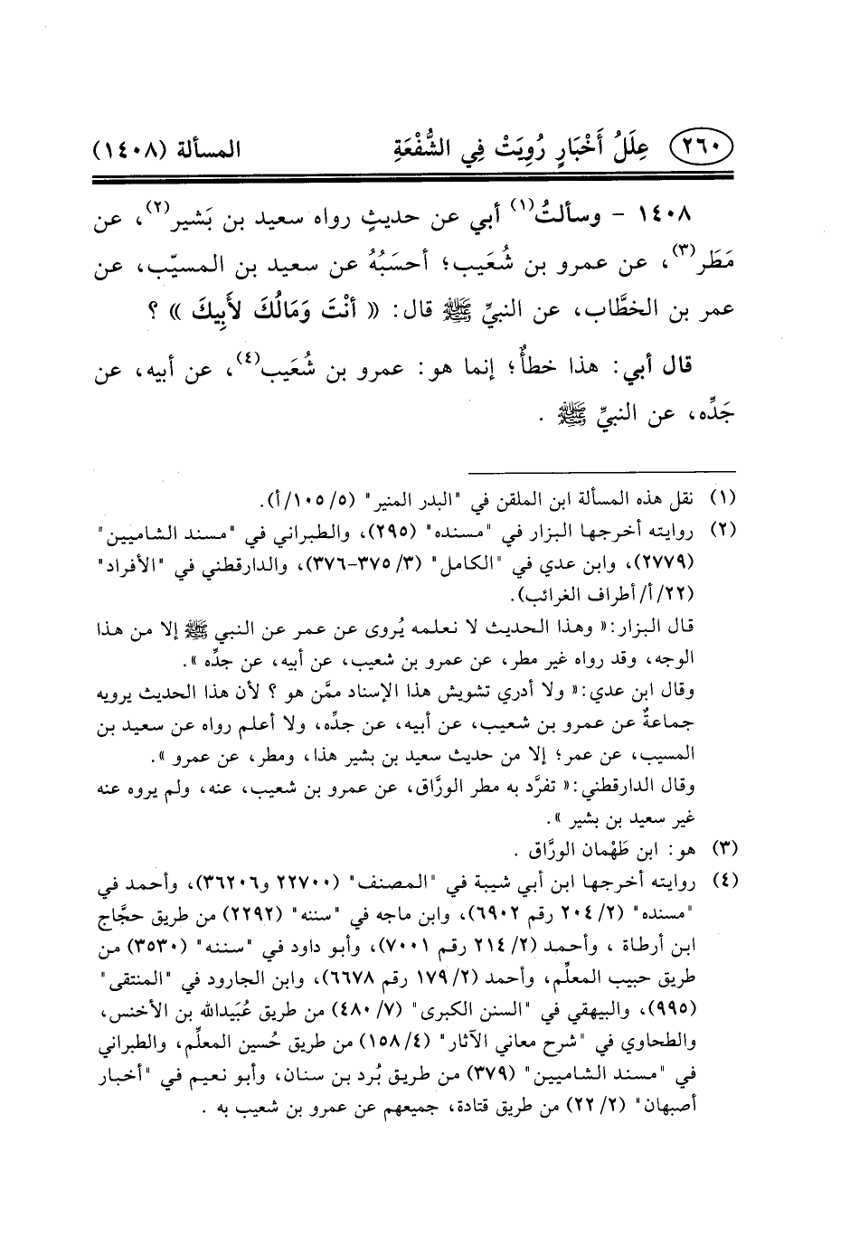 عَنْ مَطَر (٣) ، عَنْ عَمْرِو بْنِ شُعَيب؛ أحسَبُهُ عَنْ سَعِيدِ بْنِ الْمُسَيَّبِ، عَنْ عُمَرَ بْنِ الخطَّاب، عَنِ النبيِّ (ص) قَالَ: أنْتَ وَمَالُكَ لأَبِيكَ؟