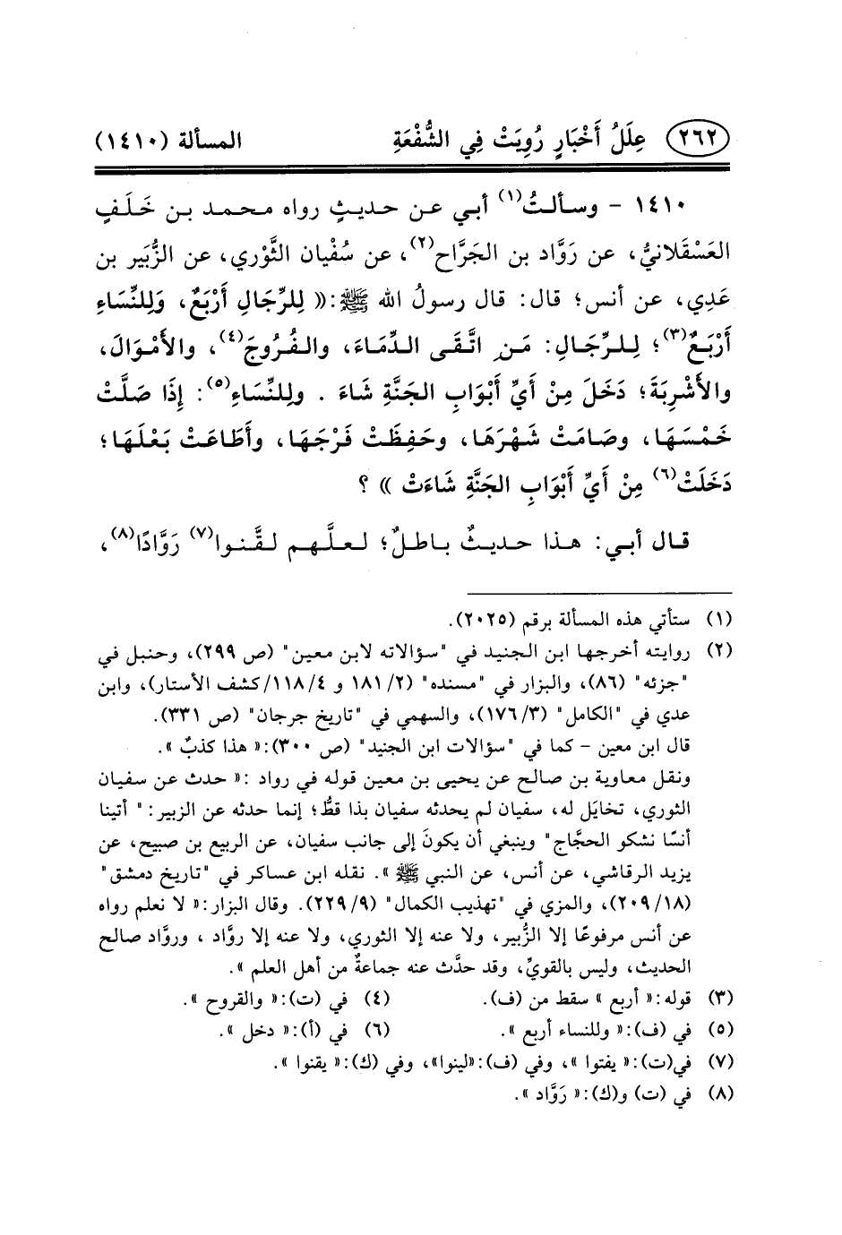 ١٤١٠ - وسألتُ (١) أَبِي عَنْ حديثٍ رَوَاهُ مُحَمَّدُ بْنُ خَلَفٍ العَسْقَلانيُّ، عَنْ رَوَّاد بْنِ الجَرَّاح (٢) ،