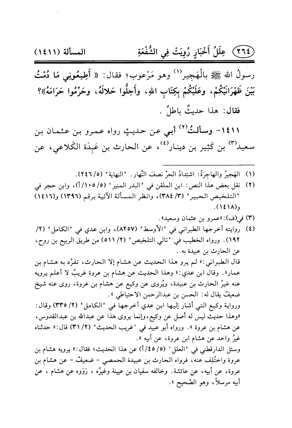 ١٤١١- وسألتُ (٢) أَبِي عَنْ حديثٍ رَوَاهُ عَمْرُو بْنُ عُثْمَانَ بْنِ سَعِيدِ (٣) بْنِ كَثِير بْنِ دِينَارٍ (٤) ،