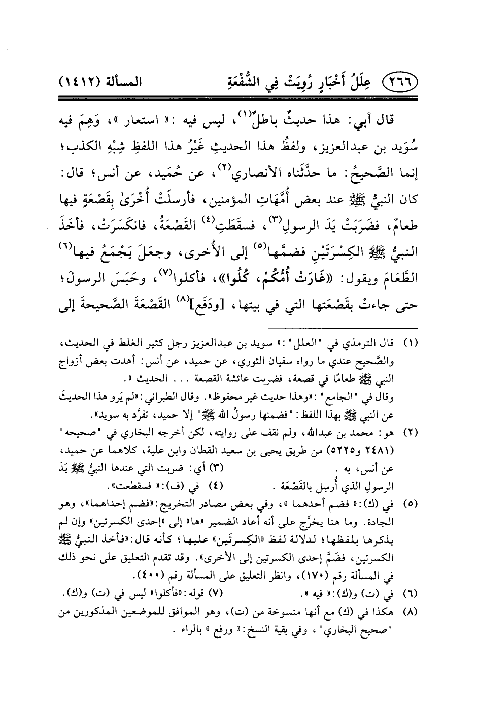 قَالَ أَبِي: هَذَا حديثٌ باطلٌ (١) ، لَيْسَ فِيهِ: «اسْتَعَارَ» ، وَهِمَ فِيهِ سُوَيد بن عبد العزيز، ولفظُ هَذَا الحديثِ غَيْرُ هَذَا اللفظِ شِبْهِ الْكَذِبِ؛ إِنَّمَا الصَّحيحُ: مَا حدَّثَناه الأَنْصَارِيُّ (٢) ، عَنْ حُمَيد، عَنْ أَنَسٍ؛ قَالَ: كَانَ النبيُّ (ص) عِنْدَ بَعْضِ أُمَّهَاتِ الْمُؤْمِنِينَ، فأرسلَتْ أُخْرَى بِقَصْعَةٍ فِيهَا طعامٌ، فضَرَبَتْ يَدَ الرسولِ (٣) ، فسقَطَتِ (٤) القَصْعَةُ، فانكَسَرَتْ، فأخَذَ النبيُّ (ص) الكِسْرَتَيْنِ فضمَّها (٥) إلى الأُخرى، وجعَلَ يَجْمَعُ فيها (٦) الطَّعَامَ وَيَقُولُ: غَارَتْ أُمُّكُمْ، كُلُوا، فَأَكَلُوا (٧) ،