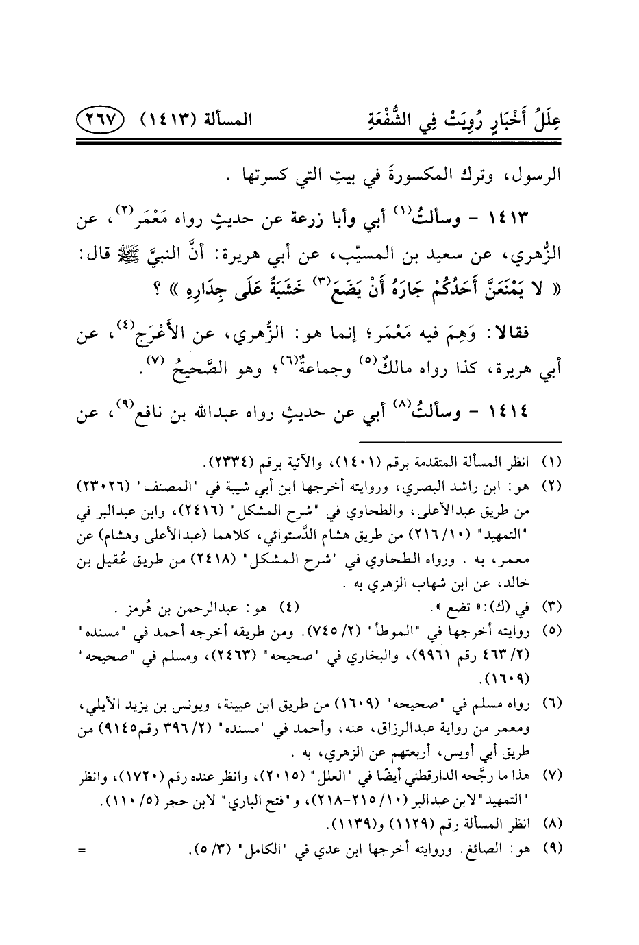 (٧) هذا ما رجَّحه الدارقطني أيضًا في "العلل" (٢٠١٥) ، وانظر عنده رقم (١٧٢٠) ، وانظر "التمهيد"لابن عبد البر (١٠/٢١٥-٢١٨) ، و"فتح الباري" لابن حجر (٥/١١٠) .